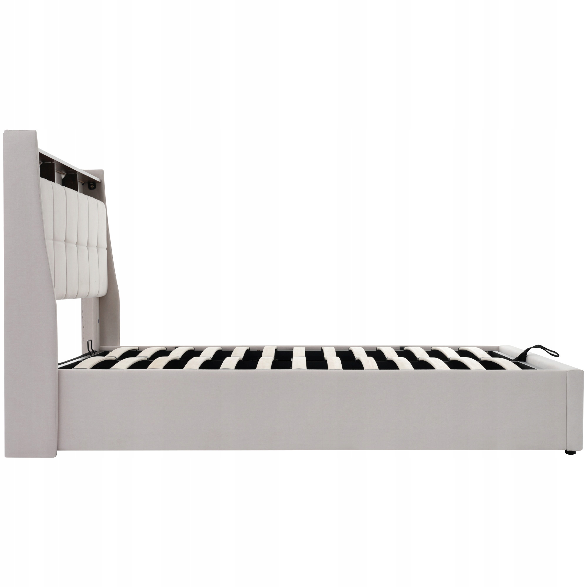 Гибкое и просторное пространство для хранения: на полке вы можете хранить мобильные телефоны или таблетки. Благодаря поддержке амортизатора газового шока, пространство под планками под кроватью можно использовать для хранения больших предметов. Рамка для плащника может быть легко сложена с помощью подъемных тканевых полос. Ткань, не связанная с потерей, прикреплена к дне кровати, которая защищает от пыли.