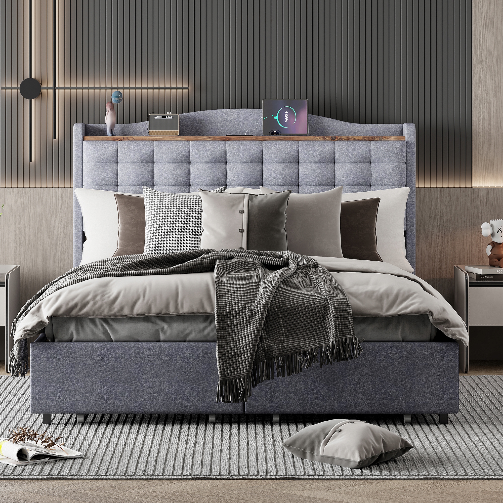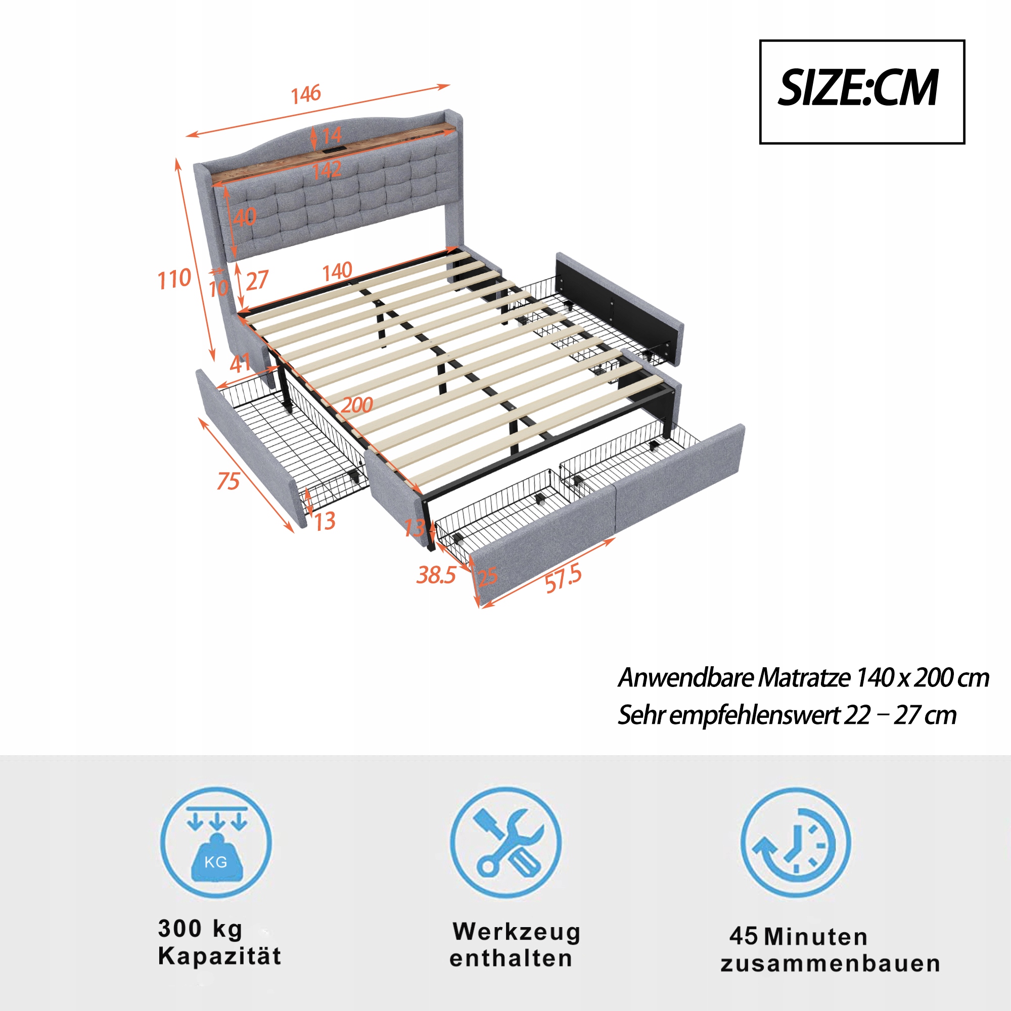 Обитая кровать 140x200 см, прикроватная таблица, USB, 4 ящика, серое белье