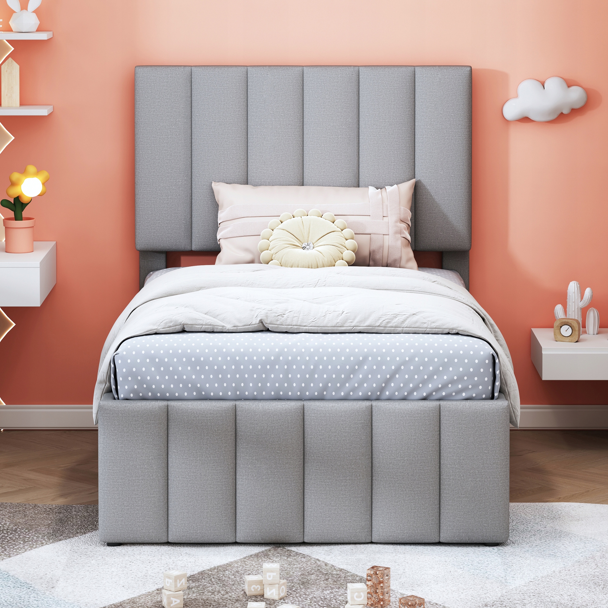 Кровать 90 х 200 см с выдвижной кроватью и ящиками для хранения вещей, приятная для кожи льняная обивка, плоская односпальная кровать, детская кровать, молодежная кровать, гостевая кровать (серая)