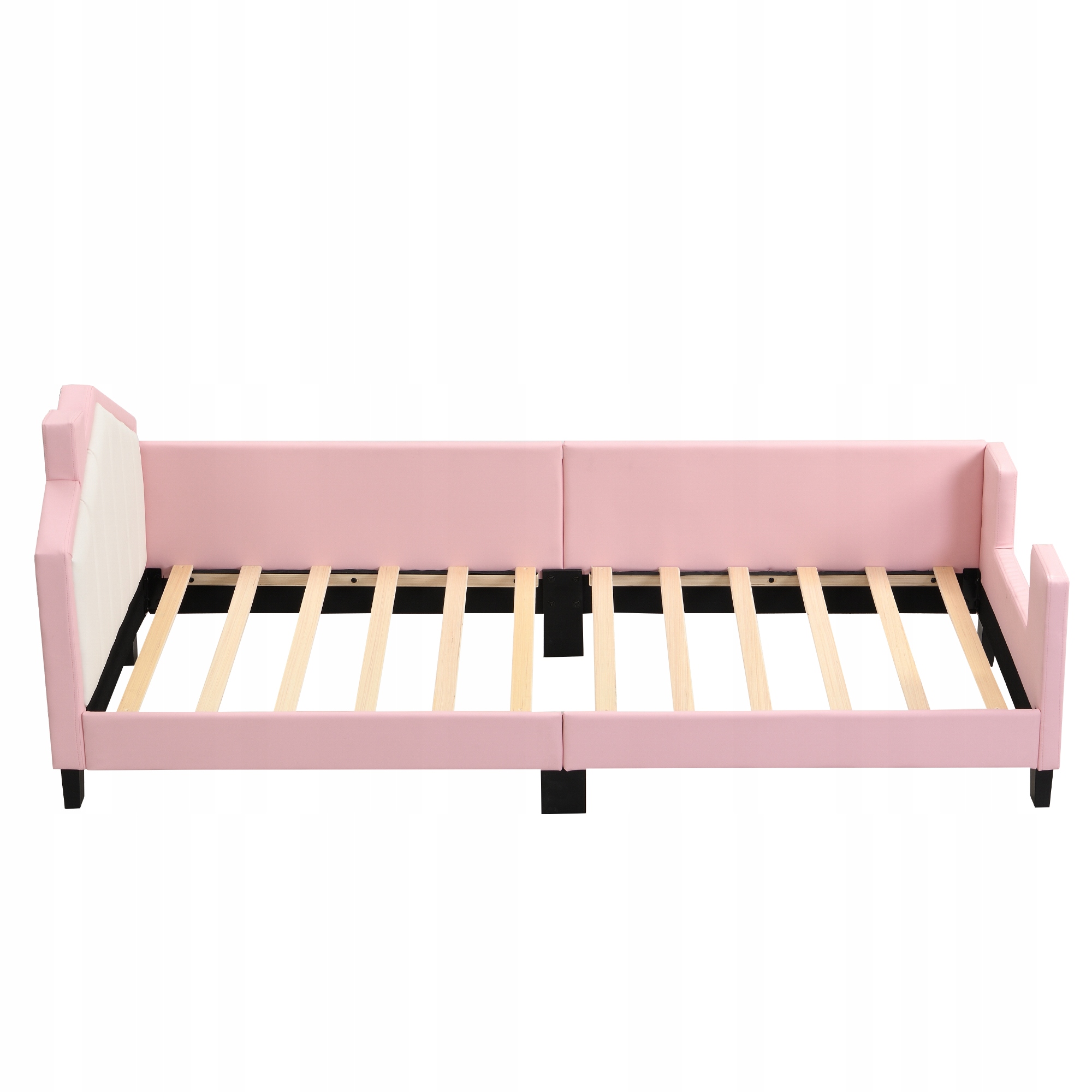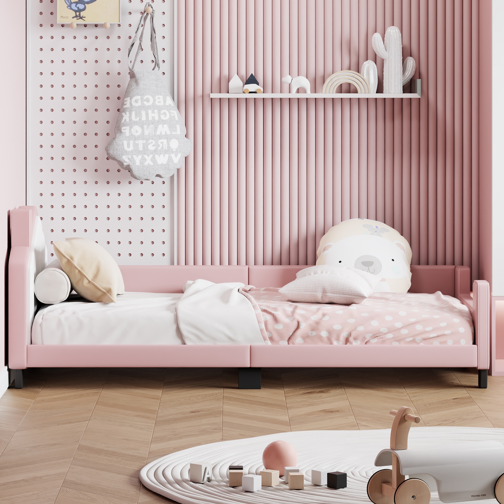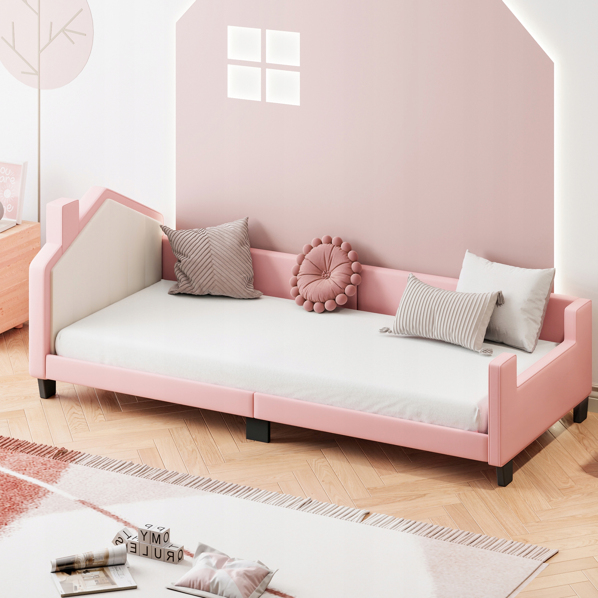 Обитая кровать 90*200, Детский диван детского кровати от кожи PU с изголовью и подвеской, задним домом для мальчиков и девочек, Pink