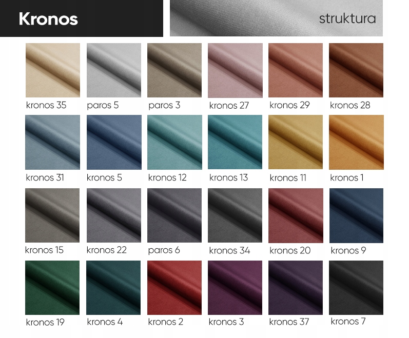 • KRONOS (плюш) – очень приятный и нежный на ощупь с заметным плотным и густым пушком, слегка оттеняющимся в зависимости от положения волос и угол падения света. Ткань прочная и устойчива к скатываниям во время использования. Удобство в уборке также является большим преимуществом. Поверхность материала устроена таким образом, что на ней не видны частицы пыли. Отличительная черта Кроноса – характерное мерцание материала. Он добавляет элегантности и ассоциируется с красивыми, элегантными интерьерами. По этой причине он высоко ценится за свои визуальные аспекты. Устойчивость к истиранию: 50 000 циклов