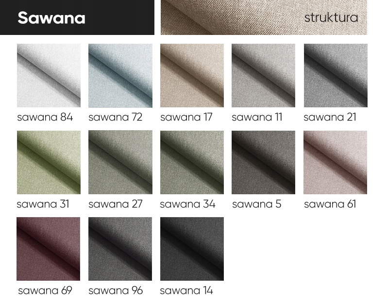 • SAWANA (тонкая и плотная плетенка) – характеризуется тонким, плотным и ровным полотняным переплетением. Он доступен во многих однородных, нежно меланжевых цветах. Он сплетен из 2-х цветных ниток. Его ценят за то, что он идеально садится на мебель. Обивочные ткани коллекции Sawana считаются одними из самых популярных тканей в мебельной промышленности, их часто используют для обивки готовой мебели, которую можно увидеть в мебельных салонах по всей стране. Устойчивость к истиранию: 100 000 циклов