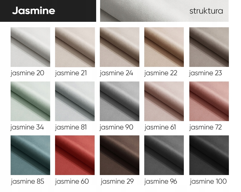 • ЖАСМИН (плюш) - устойчив к истиранию, очень прочный, очень мягкий и доступный в естественной цветовой гамме. Он плюшевый, поэтому ткань «расчесывается с волосами». Кроме того, ткань имеет специальное покрытие, которое облегчает содержание ткани в чистоте. Устойчивость к истиранию: 100 000 циклов