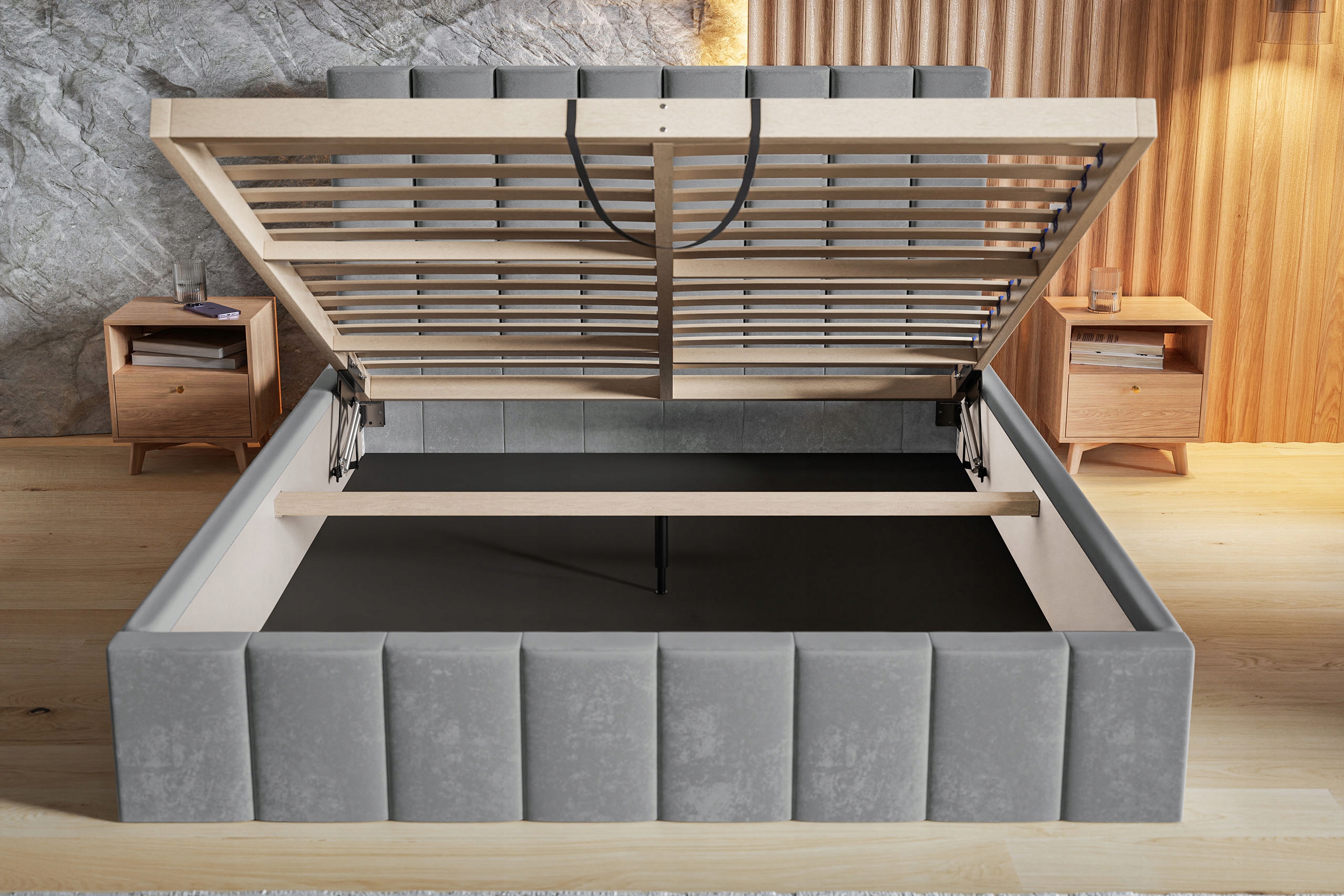 - Контейнер для постельных принадлежностей располагается на всей поверхности кровати.