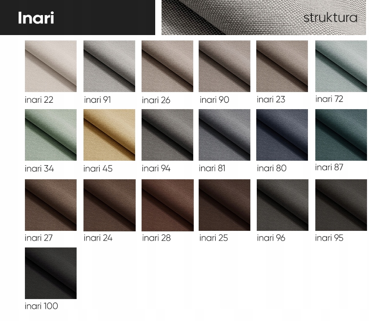 • ИНАРИ (структурная тесьма) – обивочная ткань с переплетением, имитирующим натуральную льняную ткань. Нитки разных оттенков делают материал не одного цвета. Простое и прочное плетение делает INARI идеальным материалом для повседневного использования. Устойчивость к истиранию: 49 000 циклов