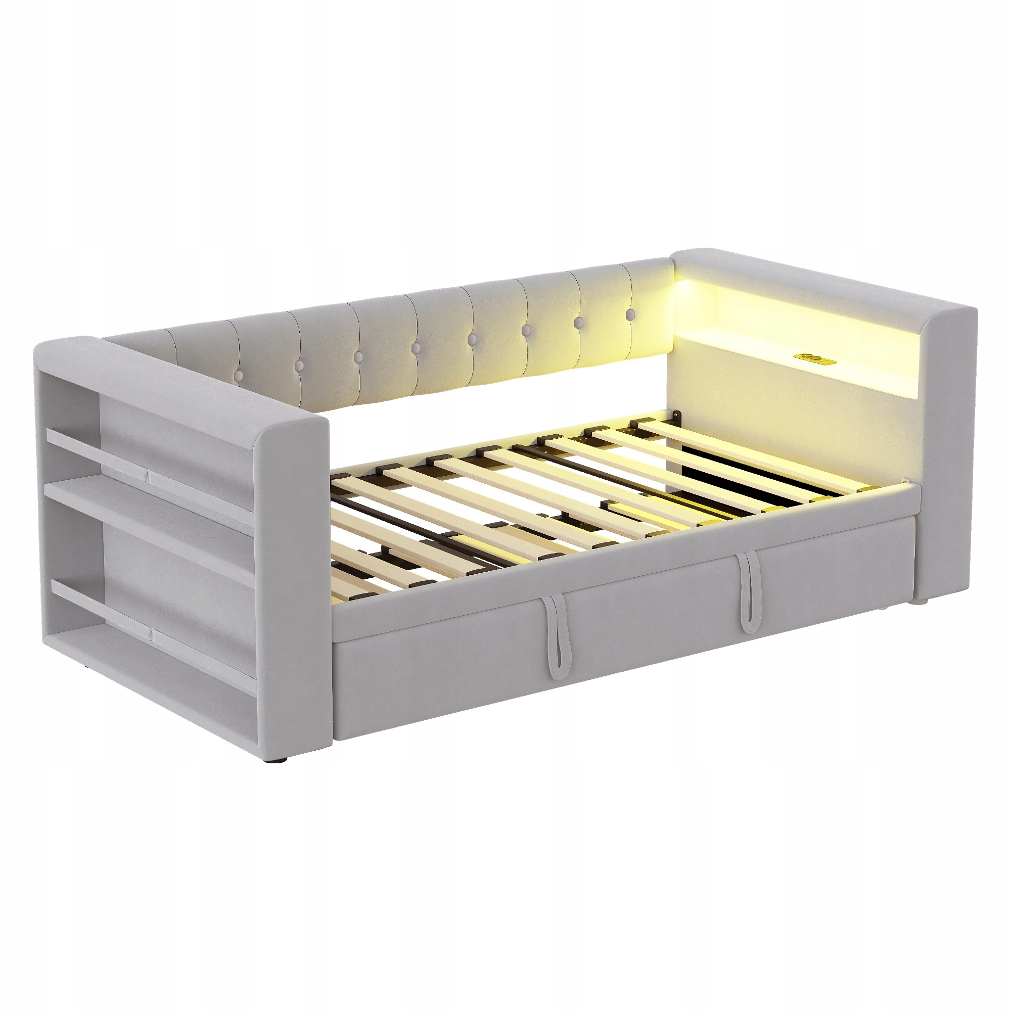 Кровать с мягкой обивкой 90/180×190 см со светодиодным освещением, электрическими розетками и большим количеством места для хранения вещей; Кровать с мягкой обивкой, многофункциональный диван, односпальная кровать, Цвет Светло-серый