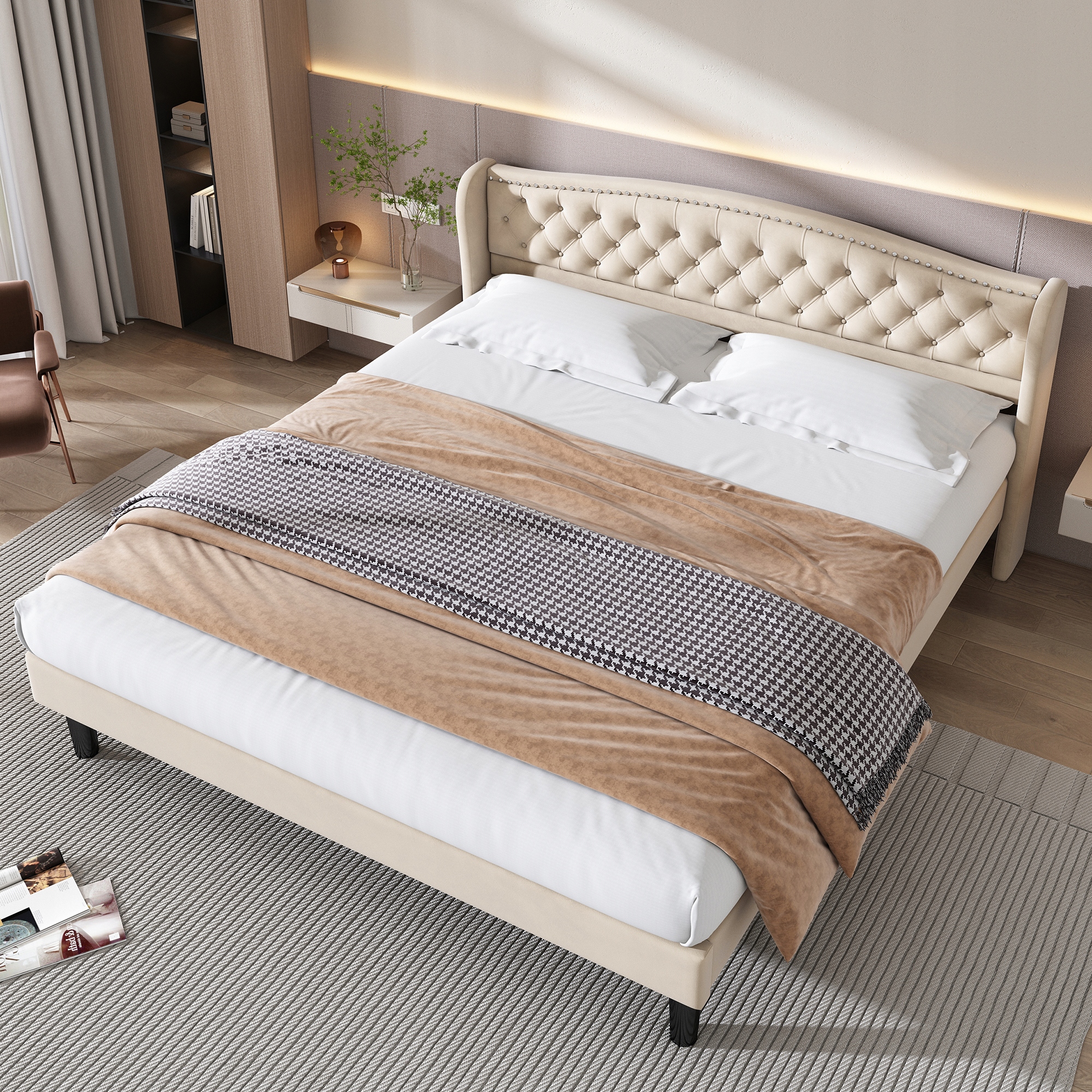 Стильная мягкая обитая кровать с бархатным подголовником, 140*200 см, декор пуговиц и твердые деревянные панели, бежевый