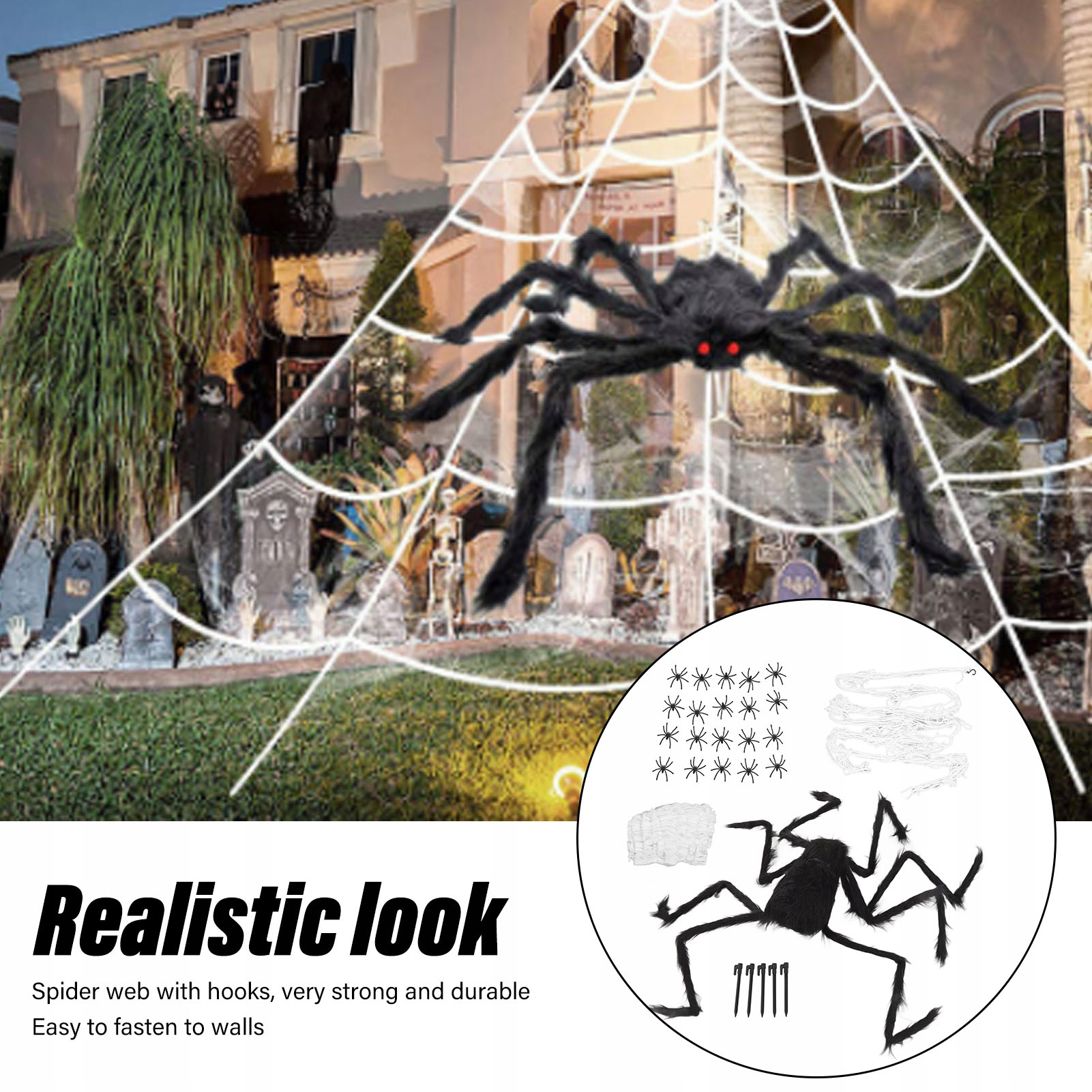 Функция: 1. Реалистичный вид: гигантские паутины для Хэллоуина сделаны из более толстых, более сильных и пушистых канатов, благодаря которой паутина выглядит реалистично. Черный паук с его ужасными красными глазами и меховыми взглядами и чувствует себя реальным.