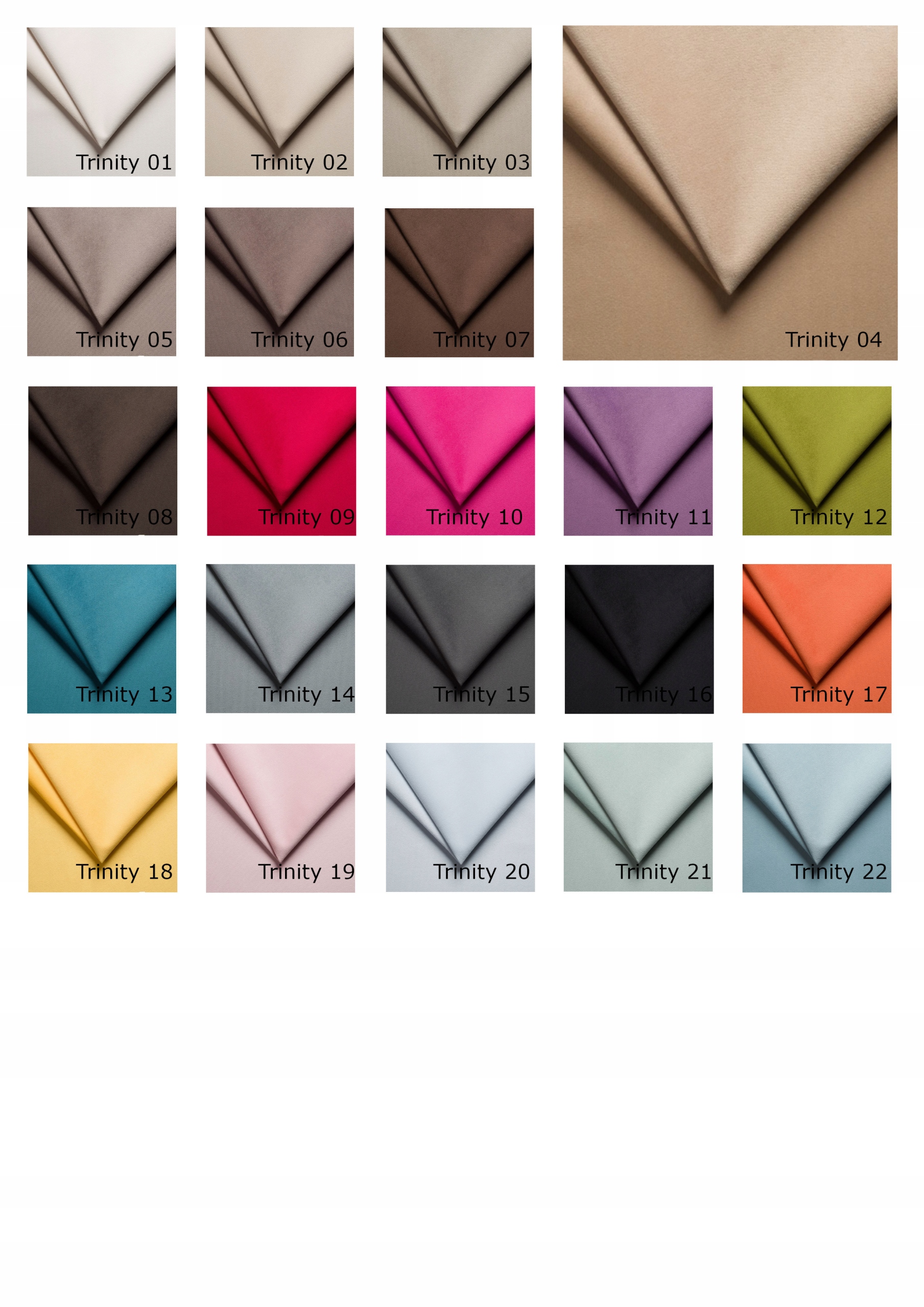 - Тринити: б >популярная велюровая обивочная ткань. Его характерная особенность – нежная структура и поверхность, покрытая мелким пухом – мягкая и приятная на ощупь. Он популярен благодаря тонкому оттенку материала и матовым цветам. Устойчив к истиранию, катышкам и свету! Ткань обладает ограниченными свойствами впитывания жидкости, что положительно влияет на ее чистоту.