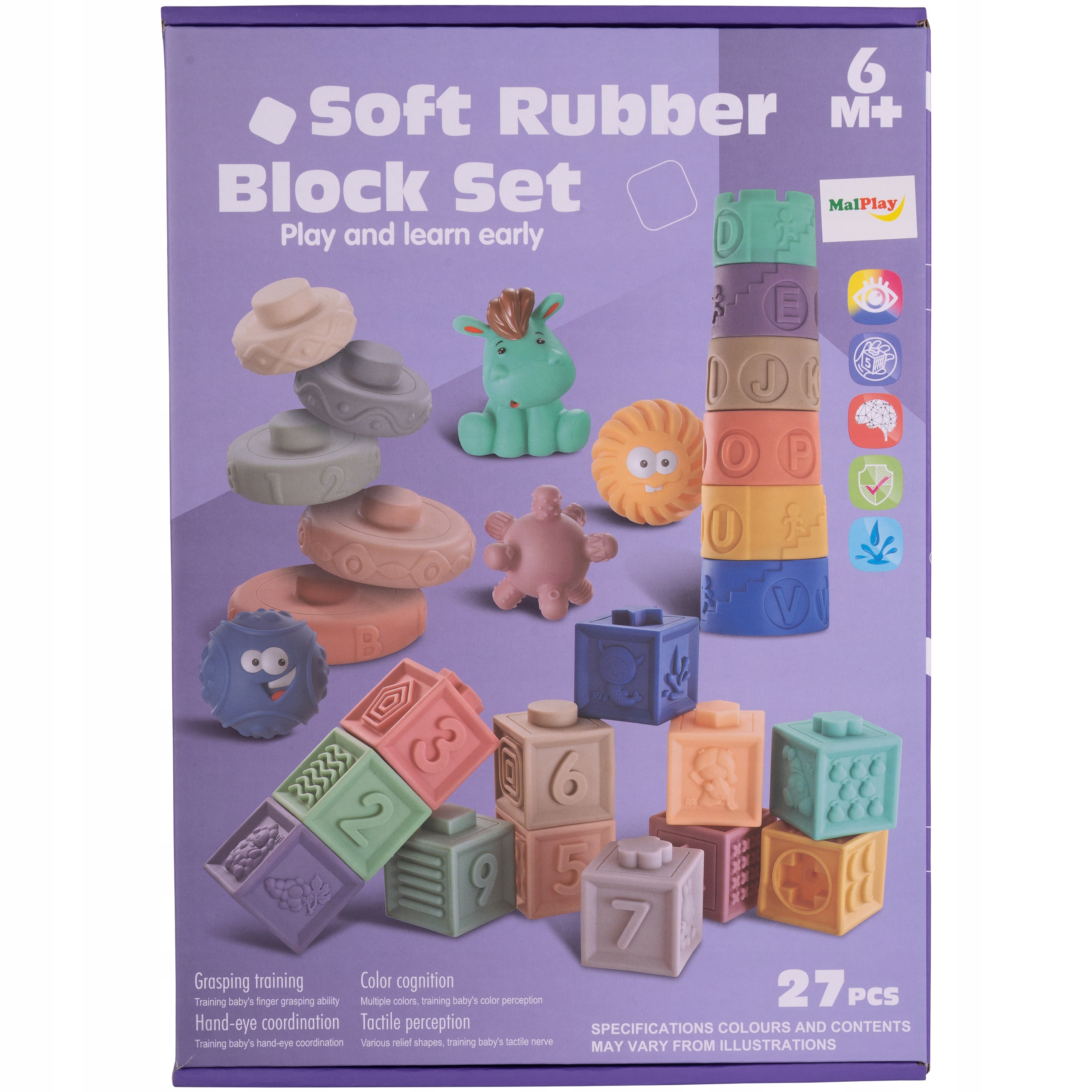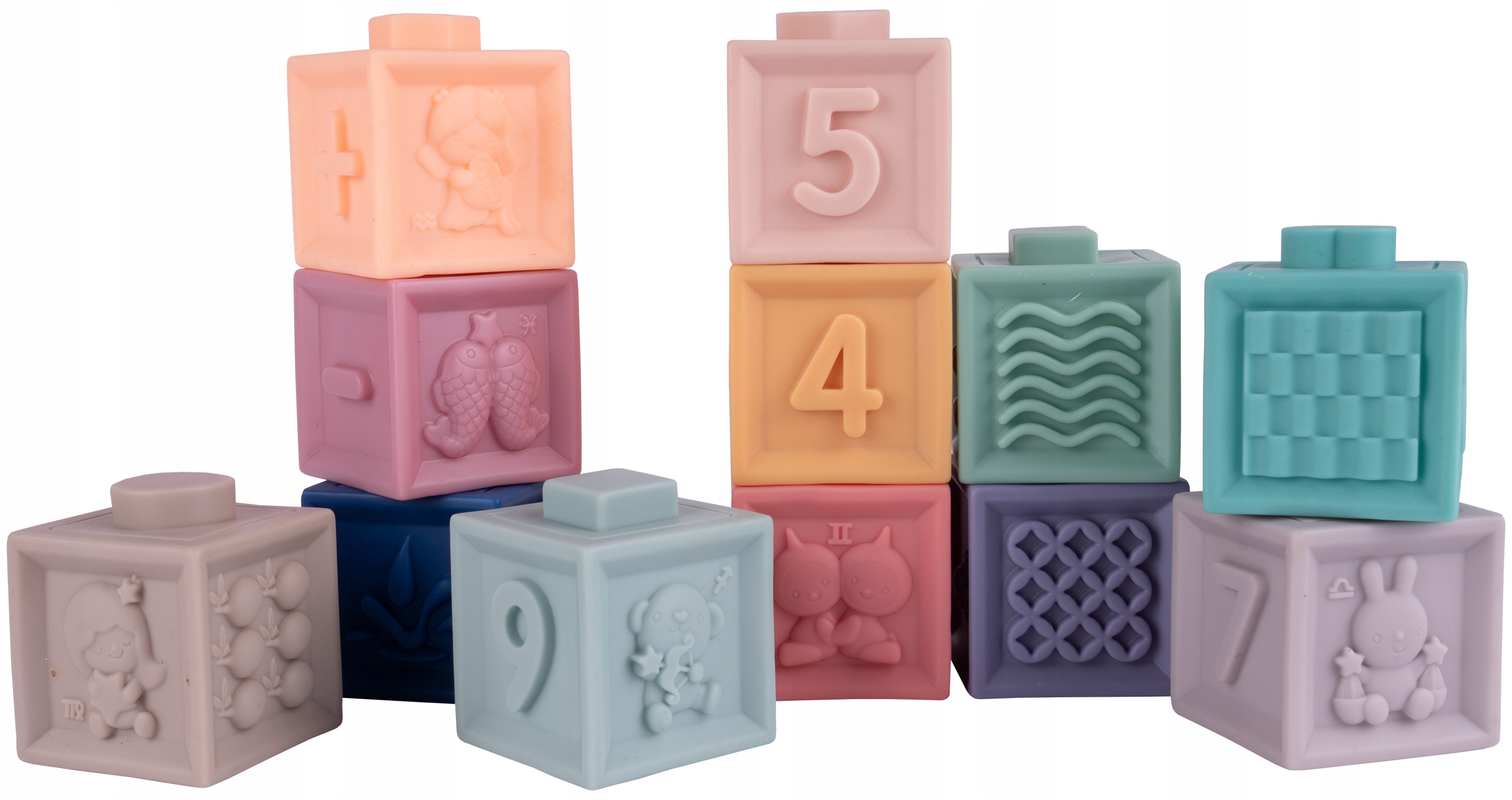 - Каждый квадратный блок имеет разную сторону и цвет. Благодаря своей структуре они идеально подходят в качестве прорезывателей для малышей. Блоки скрипят при нажатии.