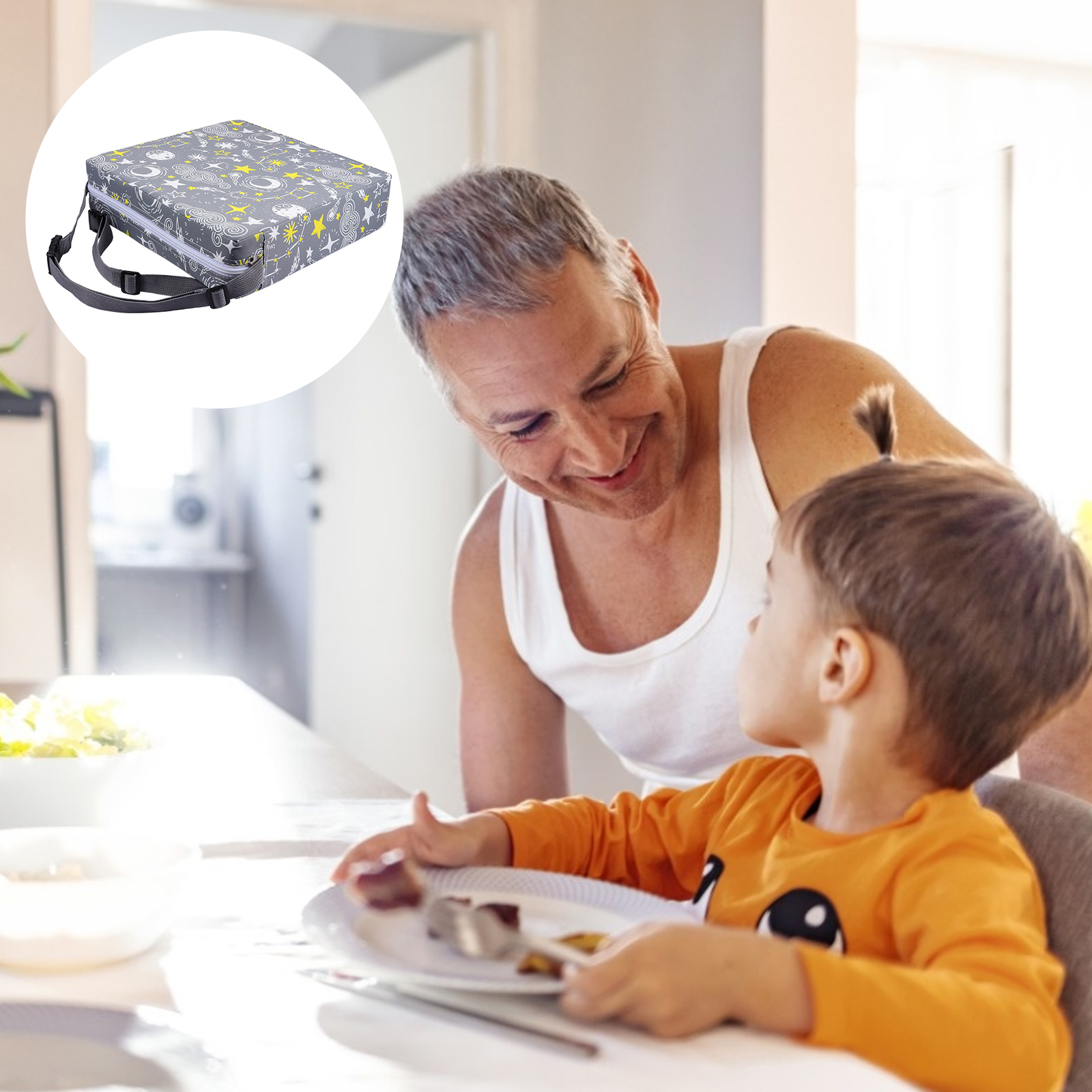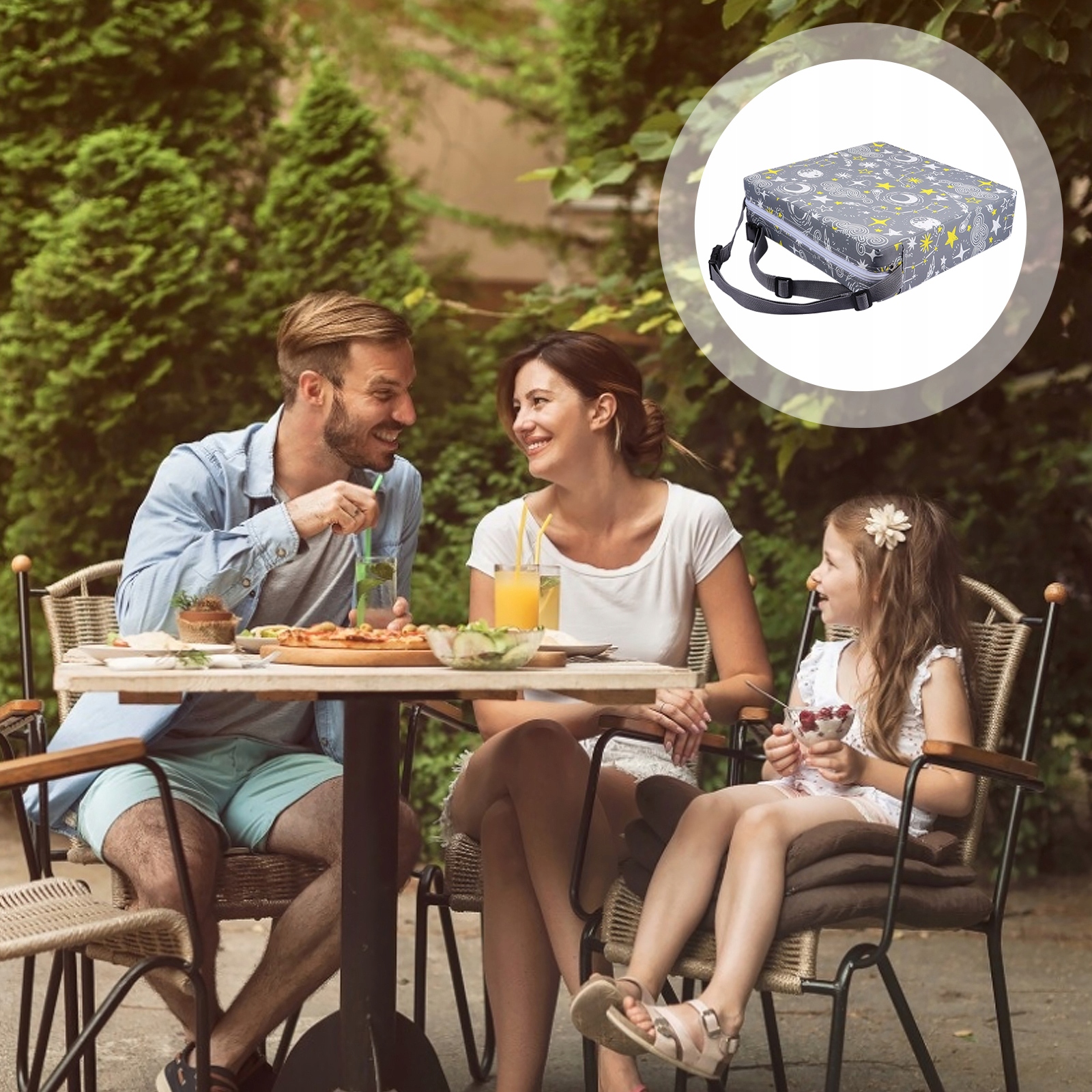 Застегиваемый ремень на подушке не скользит, обеспечивая безопасность детей во время еды.