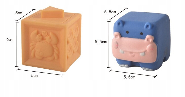 В комплект входит 12 кубиков. На 6 из них изображены различные животные, а на следующих 6 — выпуклые числа, геометрические фигуры, формы, фрукты, животные, математические знаки.
