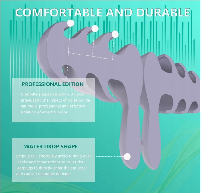 3-слойные противошумные беруши в форме зонтика, подходящие для плавания, дайвинга или специальной работы, могут проникать глубоко в улитку, блокировать шум и быть водонепроницаемыми. Уникальный каплевидный хвостик беруш эффективно предотвращает попадание беруш в ушной канал и повреждение слуха.