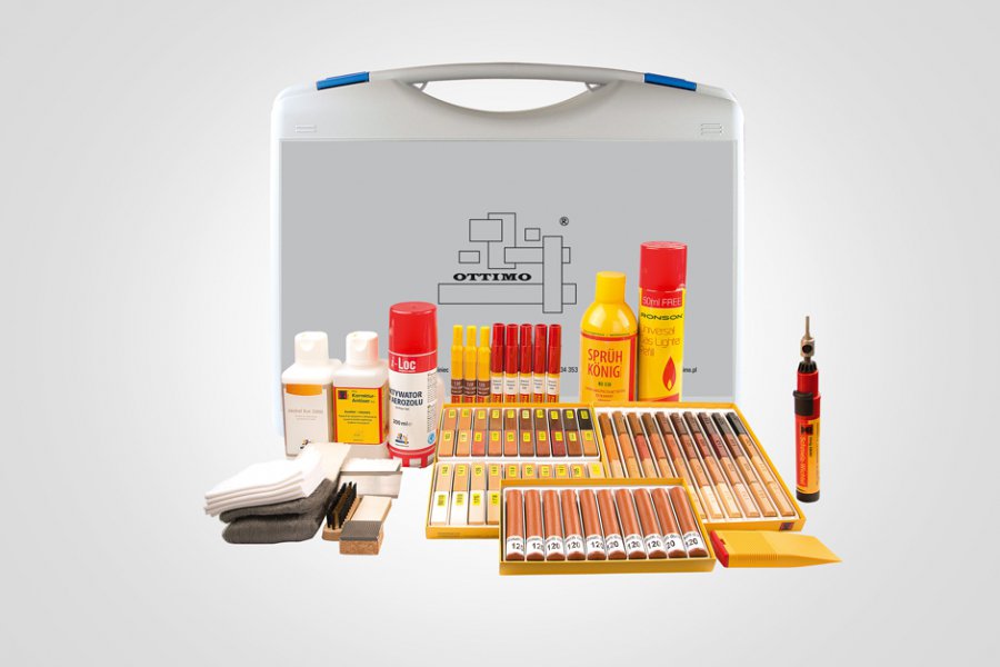 После очистки и обезжиривания поврежденного участка нанесите соответствующую порцию воска, надавив шпателем С40. Удалите излишки шпателем C40. Обезжирить жидкостью C51, а затем заматировать серым волокном C62. Защитите поверхность лаком С31 с соответствующим блеском. Для ламината используем С31 004.