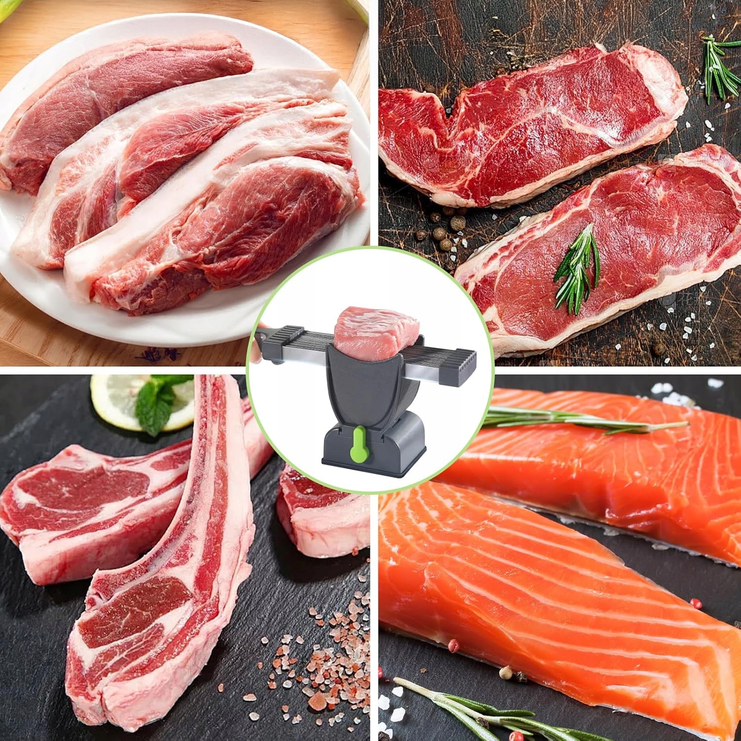 🥩Режет 18 ломтиков одновременно: Набор для нарезки мяса обеспечивает максимальную точность нарезки: 17 лезвий легко нарезают свежее мясо на 18 тонких ломтиков за один разрез, подходят для широкого спектра свежего мяса, включая свинину, говядину, куриную грудку и лосося.... (не подходит для замороженного или обезвоженного мяса).