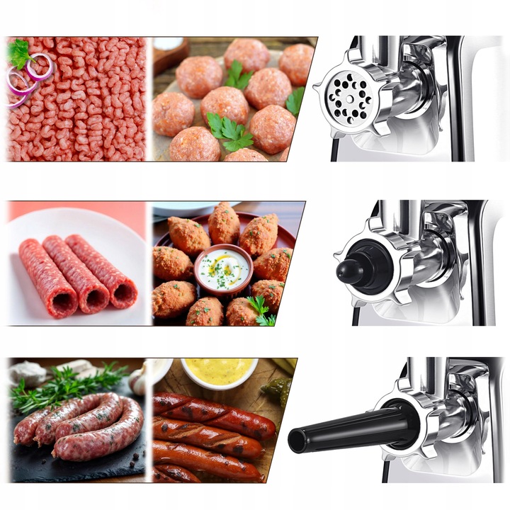 Наш набор универсален на вашей кухне! 3 ситечка (3 мм, 5 мм, 7 мм) позволяют создавать идеальные текстуры фарша, а дополнительные насадки позволяют готовить домашние колбаски, кеббе и фаршированные деликатесы.