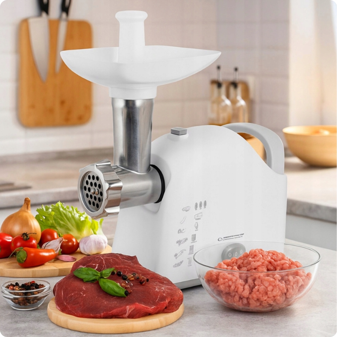 Двигатель максимальной мощностью 2200Вт гарантирует быстрое и равномерное измельчение даже больших порций мяса. Идеально подходит для приготовления мясных блюд, паштетов или начинок.