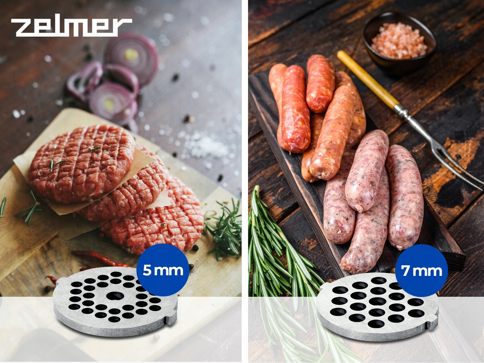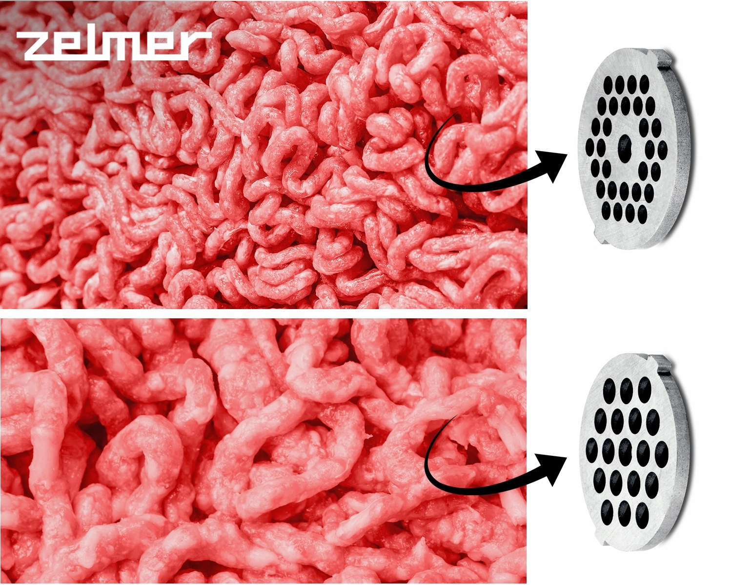 • Два сита с диаметром ячеек 5 мм и 7 мм, изготовленные из нержавеющей стали, позволяют получать различные структуры измельчения, от тонко измельченного мяса до более густого кусков.