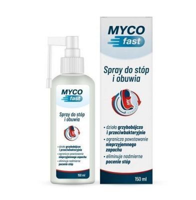 Спрей для ног и обуви MYCOfast – жидкость, предназначенная для дезинфекции внутренней части обуви с бактерицидными и фунгицидными свойствами и для неповрежденной, здоровой кожи ног с бактерицидными и дрожжевыми свойствами.