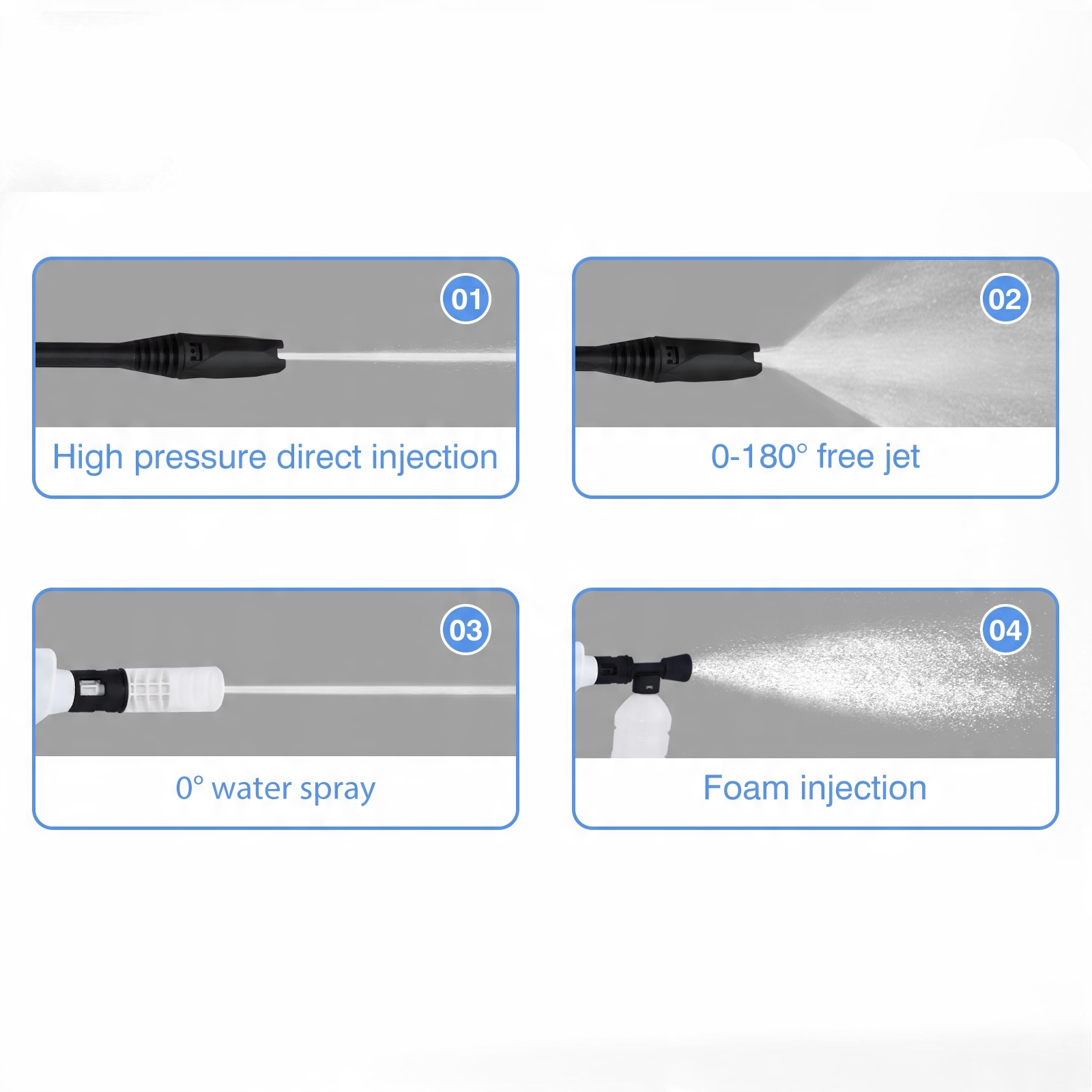 ✅【Регулируемая насадка 4-в-1】 — Наш беспроводной очиститель высокого давления поставляется с регулируемой насадкой 4-в-1: 0°, 15°, 25°, 40°. Насадку можно менять, вращая, чтобы установить режим, экономя много воды. Кроме того, мы также предлагаем насадку с резервуаром для чистящих средств (ок. 300 мл), которую можно использовать для ежедневной уборки. Быстрое пенообразование, стыковая и равномерная пена, мыть машину вместе.