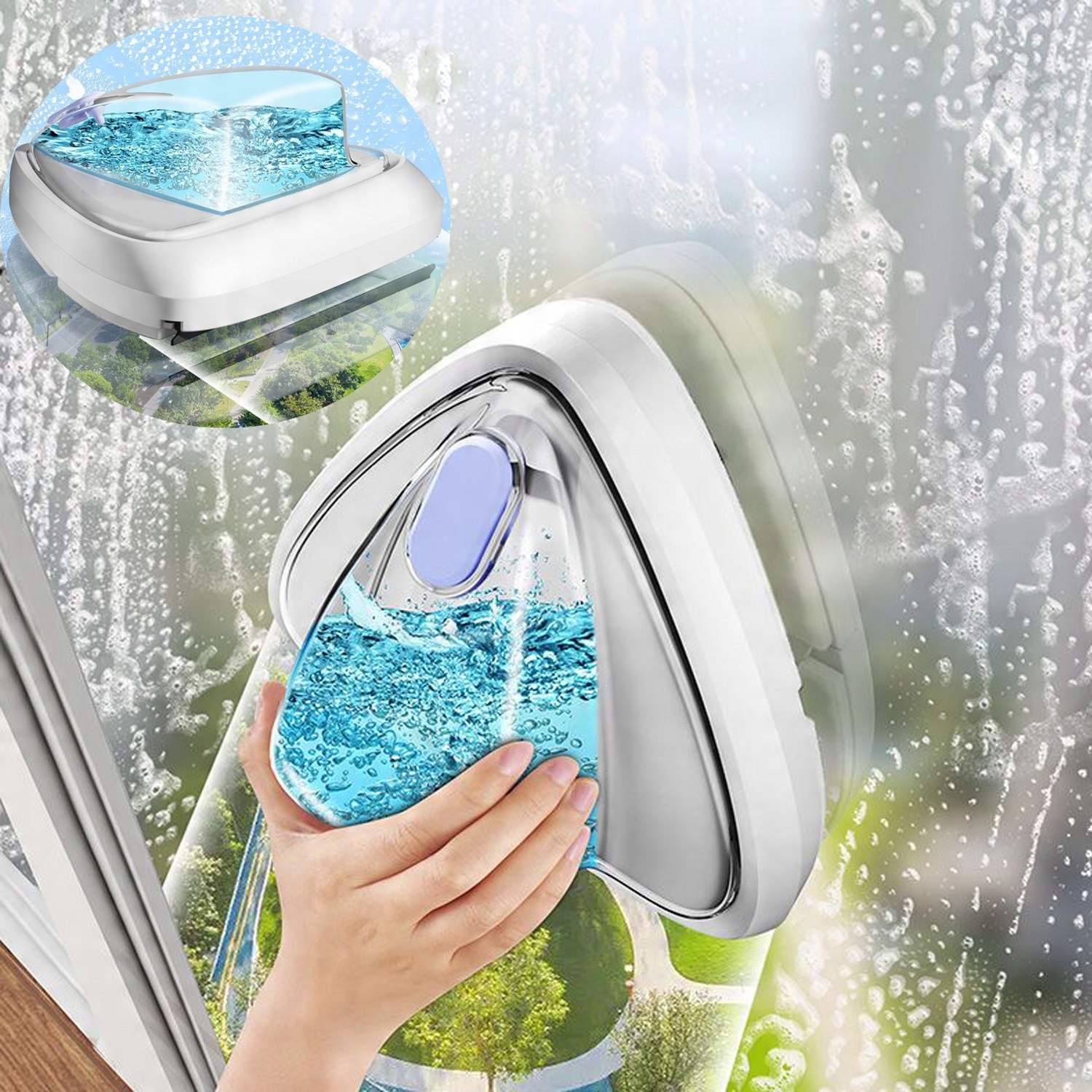 Двустороннее магнитное средство для мытья окон Hooha с функцией полива имеет дополнительную кнопку на присоске, которая увеличивает мощность всасывания устройства на 50 %, позволяя более эффективно приклеивать стекло. Идеально чистые окна при использовании!