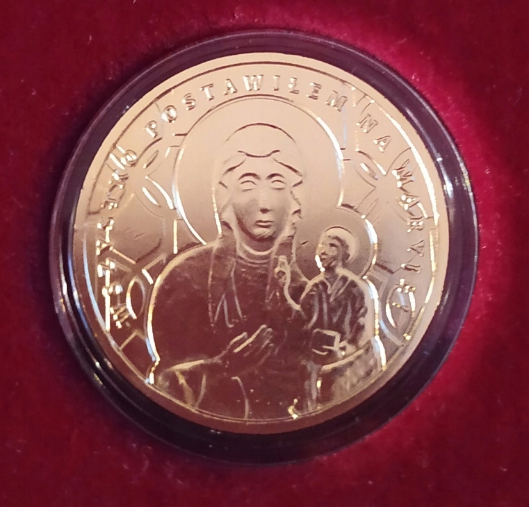 Реверс: В центре изображение Ченстоховской Богоматери; по краю по кругу с левой стороны вверх и вправо от жетона надпись: ВСЕ СТАВЛЮ НА МЭРИ.