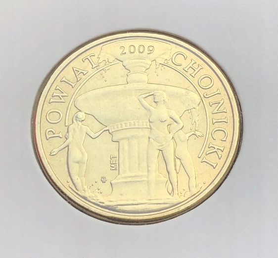 Реверс: Изображение фонтана с рыночной площади Хойнице, вверху по горизонтали год выпуска: 2009, с обеих сторон полукругом надпись: POWIAT / CHOJNICKI, рядом с колонной фонтана вертикальная надпись: MET и клеймо Варшавского монетного двора.