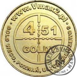 Аверс: В центре ободка стилизованный оптический огнестрельный прицел, с надписями: 4/51 (вверху) / GOLDY (внизу), вокруг полукруглая надпись монета: GOLD WECO, POZNAŃ, UL CHWALISZEWO 9 (снизу) и www. Vmax2.pl (вверху).