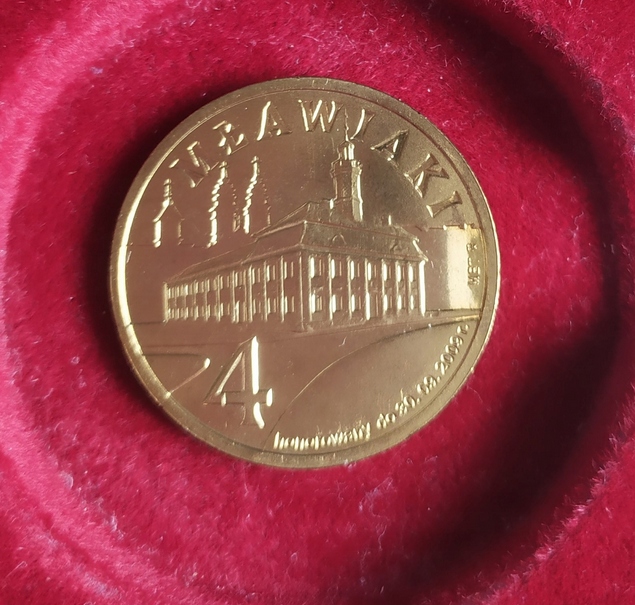 Аверс: Ратуша в Млаве, за ней очертания приходской церкви Св. Троица, под ней слева горизонтально написан номинал цифрой: 4, вверху полукругом название: MLAWIAKI, справа вертикальной надписью: MET и клеймо Варшавского монетного двора, внизу слева в полукруглой надписи: чтится до 30 сентября 2009 г.
