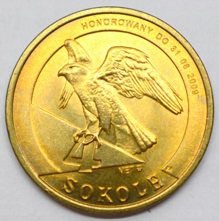 Реверс: По горизонтали номинал написан цифрой: 4, с сидящим на нем соколом, вверху номинала, справа косая надпись: MET и клеймо Варшавского монетного двора, внизу полукругом надпись: СОКОЛЕ, вверху полукругом надпись: HONORED DO 31.08.2009.