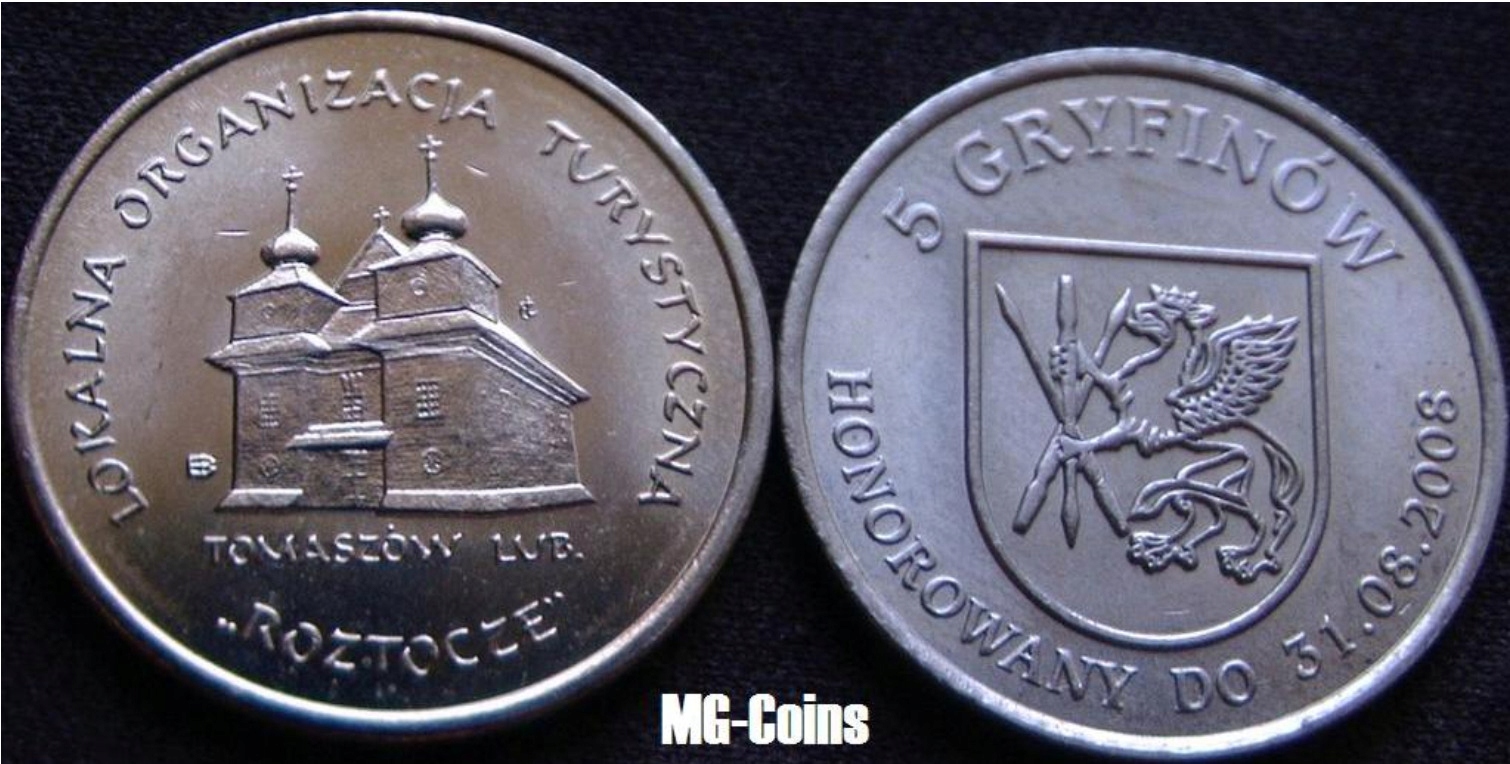 Аверс: Грифон, держащий три скрещенных копья (герб рода Замойских - герб Томашовского повята) на щите, с дугой вверху: 5 GRYFINÓW, внизу с дугой Реверс: Лиственничная церковь в Томашув-Любельском, под ней надпись: TOMASZOW LUB., слева клеймо Варшавского монетного двора, справа авторская монограмма, на вверху по дуге надпись: LOKALNA ORGANIZACJA TURYSTYCZNA, внизу по дуге надпись "ROZTOCZE".