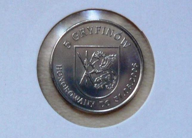 Аверс: Грифон, держащий три скрещенных копья (герб рода Замойских - герб Томашувского повята) на щите, с надписью вверху: 5 GRYFINÓW, внизу с дугой: ПОЧТЕНИЕ ДО 31.08.2008