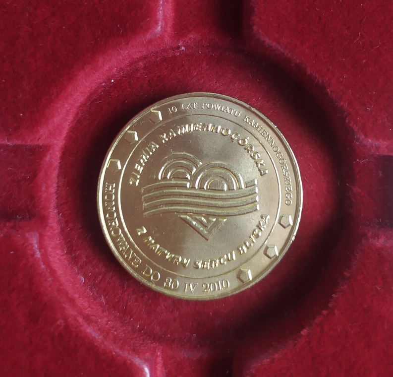 Реверс: В центре, по краю, логотип Каменногурского края. , над ней полукругом надпись: ZIEMIA KAMIENNOGÓRSKA, под ней полукругом надпись: Z NATURY SERCU CLOSE, вверху полукругом надпись: 10 ЛЕТ КАМЕННОГОРСКОГО УРАТА, внизу полукругом надпись: ПОЧИТАНО ДО 30.04.2009, на слева и справа - символические камни, по три с каждой стороны.