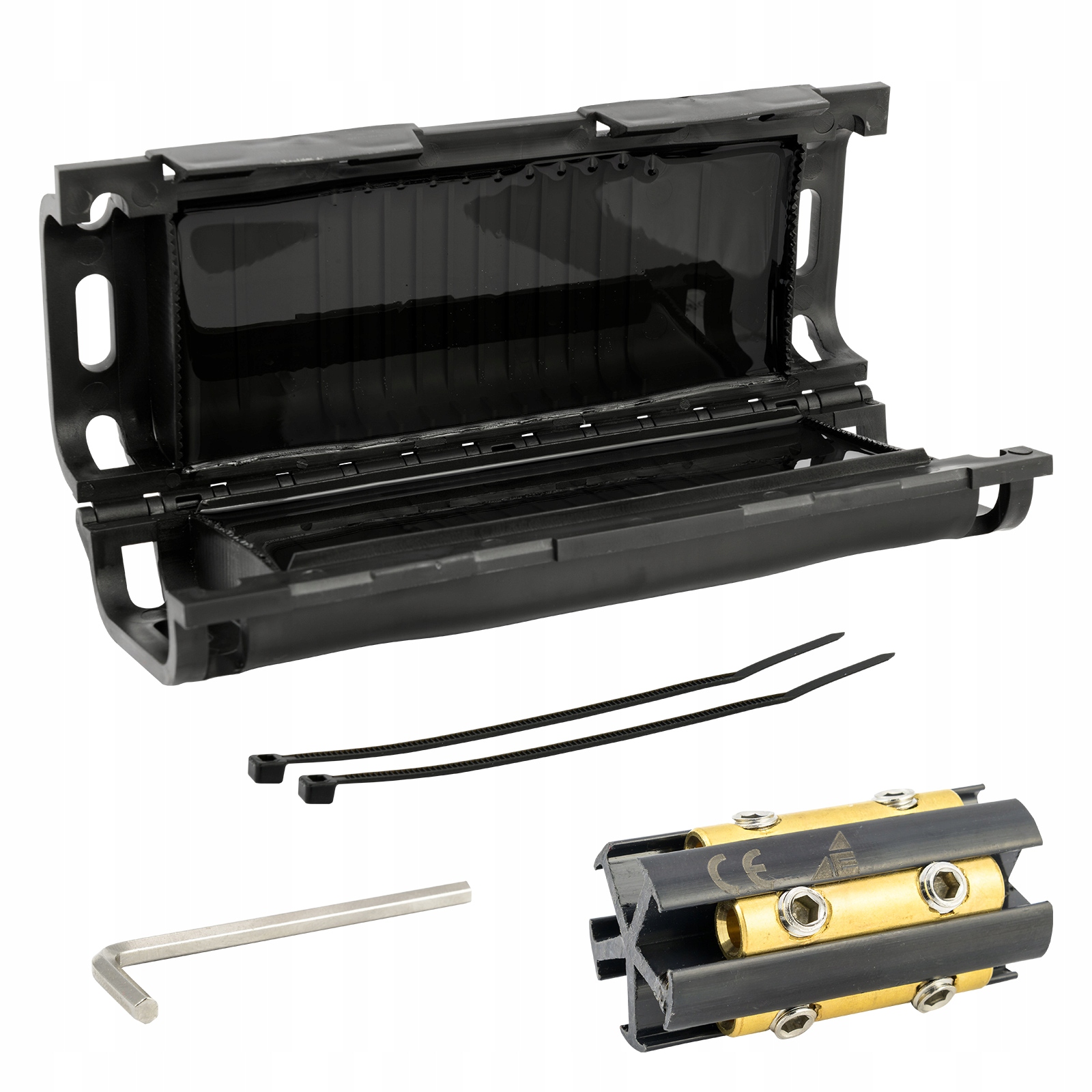 GELEBOX Гелевые кабельные муфты для соединения кабелей в самых экстремальных условиях. Адаптирован к внутренним, наружным и подземным условиям. Корпус выполнен из прочного пластика, внутри заполнен гибким прозрачным гелем. Муфта MZGEL180 с внутренними размерами 180х74х41мм имеет класс защиты IPX8, обеспечивающий механическую защиту, изоляцию и герметизацию. Разъем оснащен кабельным разъемом ZKMZGEL180 сечением 5x1,5-6 мм² (кат. № 39.1805) и не требует выбора других систем электрического подключения. Преимущество – установка, не требующая каких-либо специализированных монтажных инструментов. В комплект входит защита от вскрытия в виде кабельных стяжек и шестигранный ключ №3.