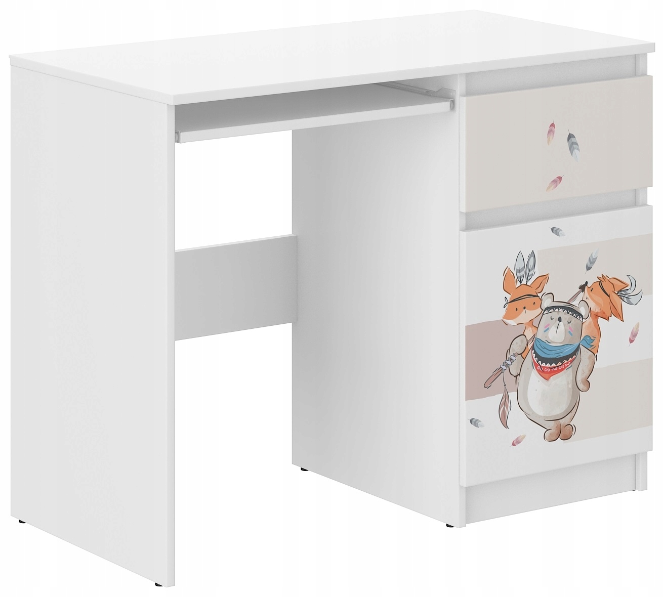 Современный детский письменный стол Н-33 – практичный и функциональный предмет мебели, который найдет свое место в каждой детской комнате. Эргономичные размеры обеспечивают свободу обустройства помещения. Письменный стол изготовлен из ДСП серф-белого цвета, отделан шпоном. Имеет функциональный один ящик и тумбу с двумя полками. Передняя часть стола украшена красочным принтом красивых, ярких цветов и защищена специальным ламинатом, предотвращающим выцветание и истирание. Его можно смело мыть тряпкой и жидкостью.