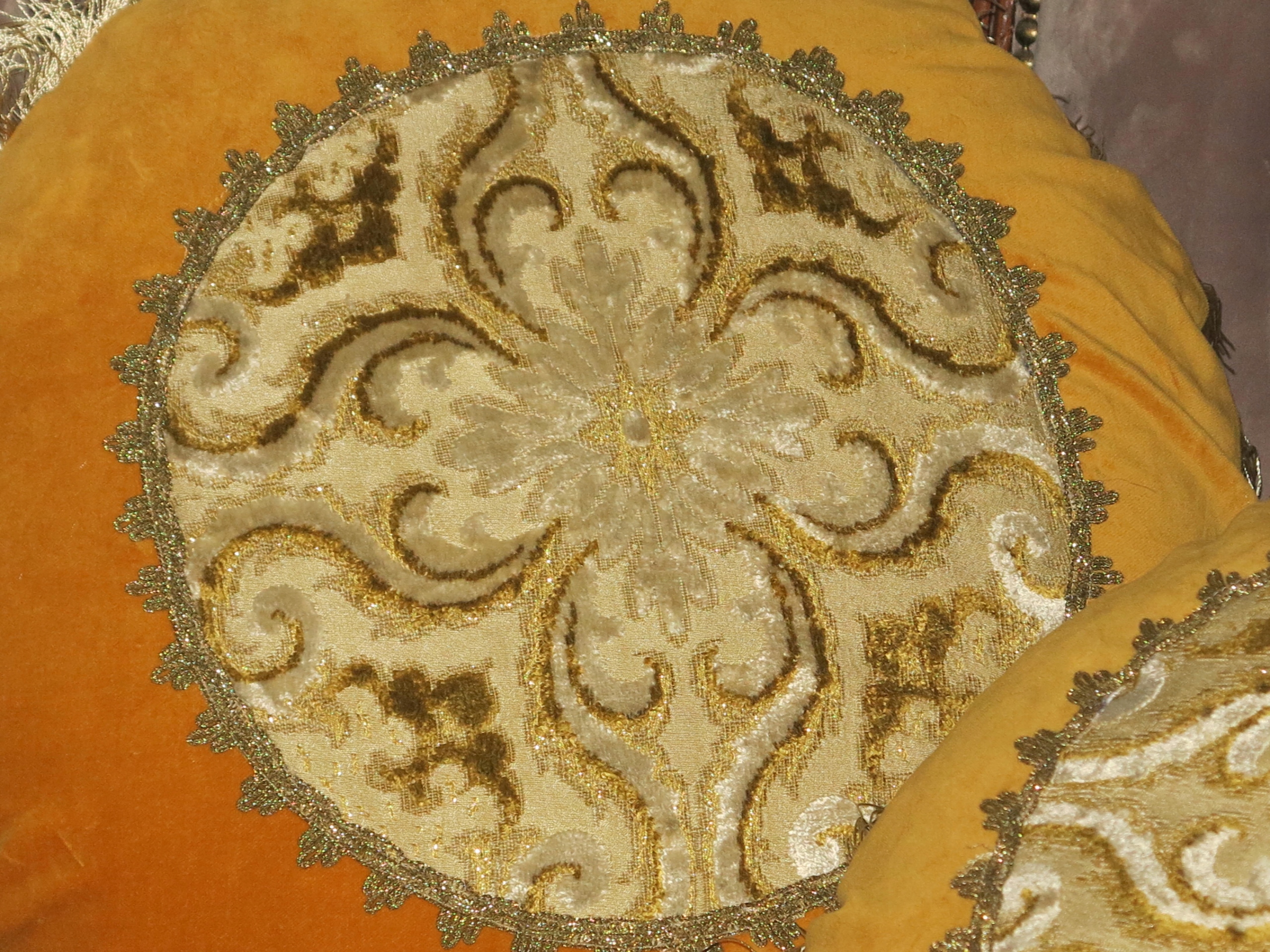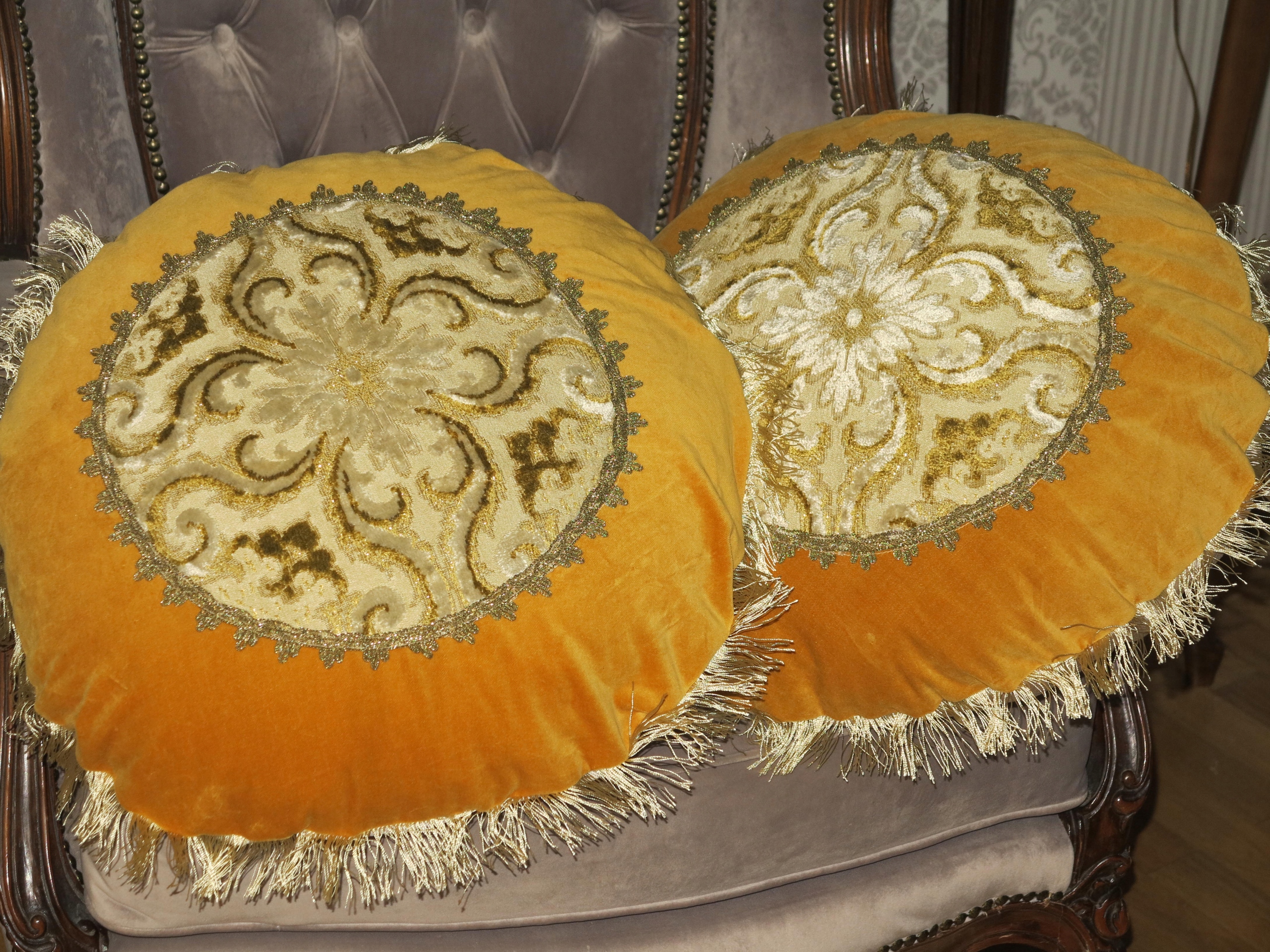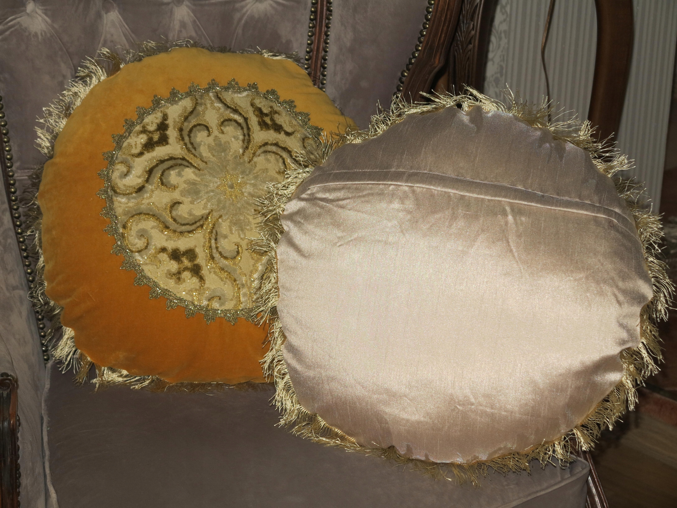 ДЛЯ ЗНАНИТЕЛЯ - НАБОР ИСКЛЮЧИТЕЛЬНОЙ КРАСОТЫ БОЛЬШИХ СТИЛЬНЫХ АНТИКВАРНЫХ КРУГЛЫХ ПОДУШЕК С НАПОЛНЕНИЕМ. ЗОЛОТО-МЕДОВЫЙ ЦВЕТ. ВОКРУГ ОТДЕЛЕНЫ ТОЛСТОЙ БАХИРОЙ