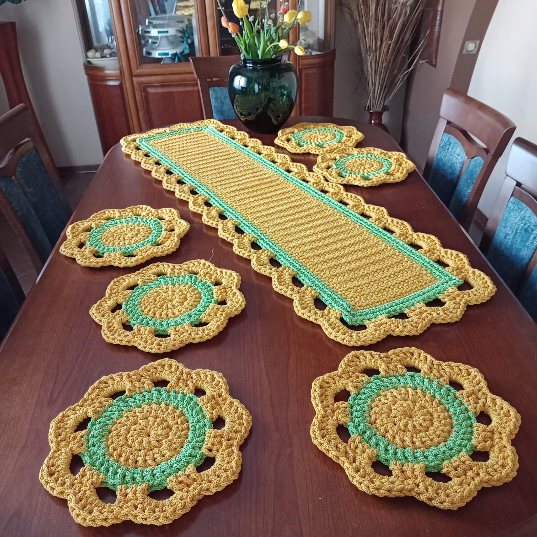 Предметом предложения является комплект - дорожка для стола размерами 40х140см и 6 шт подушечек диаметром 30см, изготовленных крючком из польской хлопчатобумажной нити толщиной 5 мм.