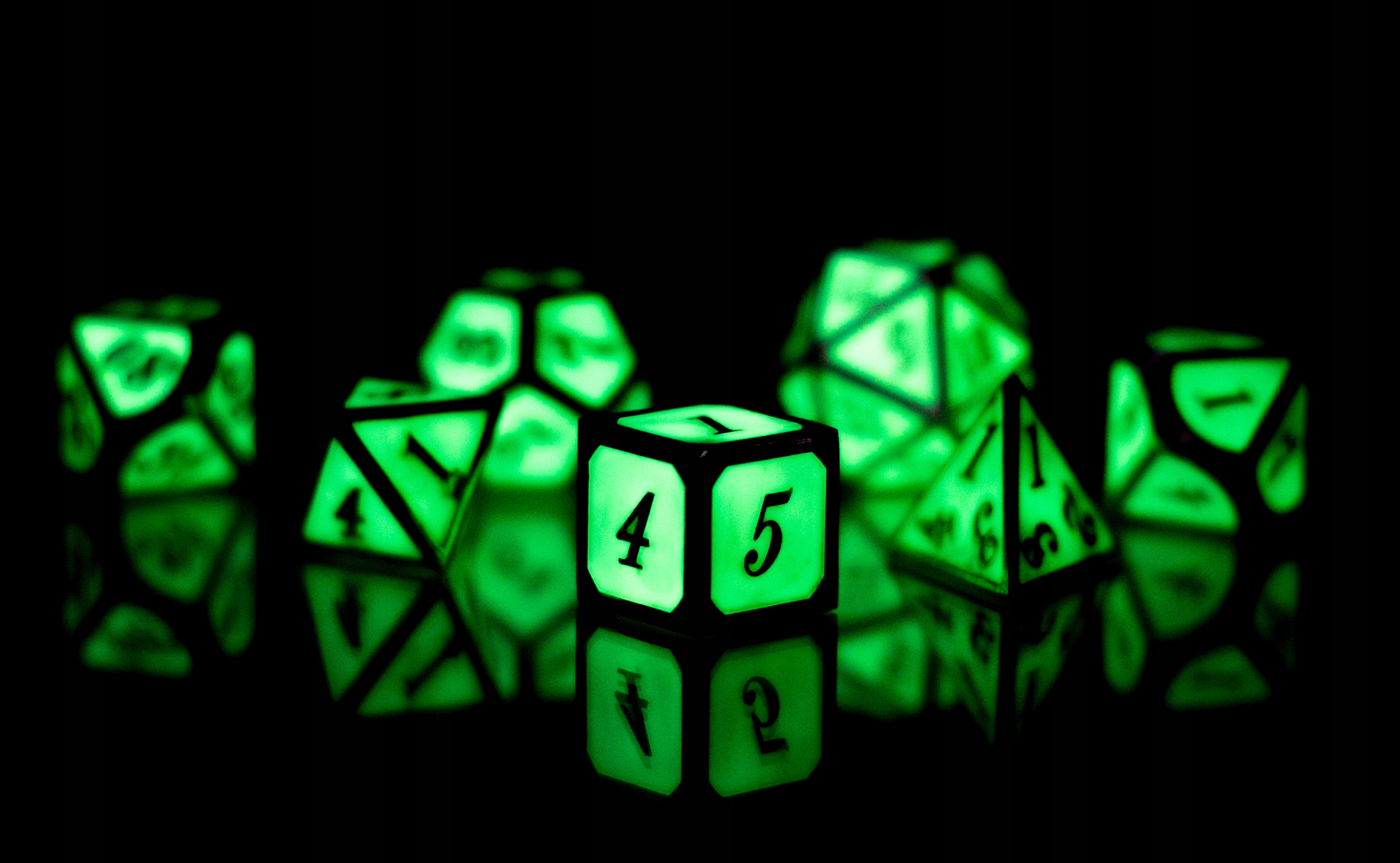 НАБОР СВЕТЯЩИХСЯ В ТЕМНОТЕ ИЗ 7 МЕТАЛЛИЧЕСКИХ КУБИКОВ ДЛЯ РПГ