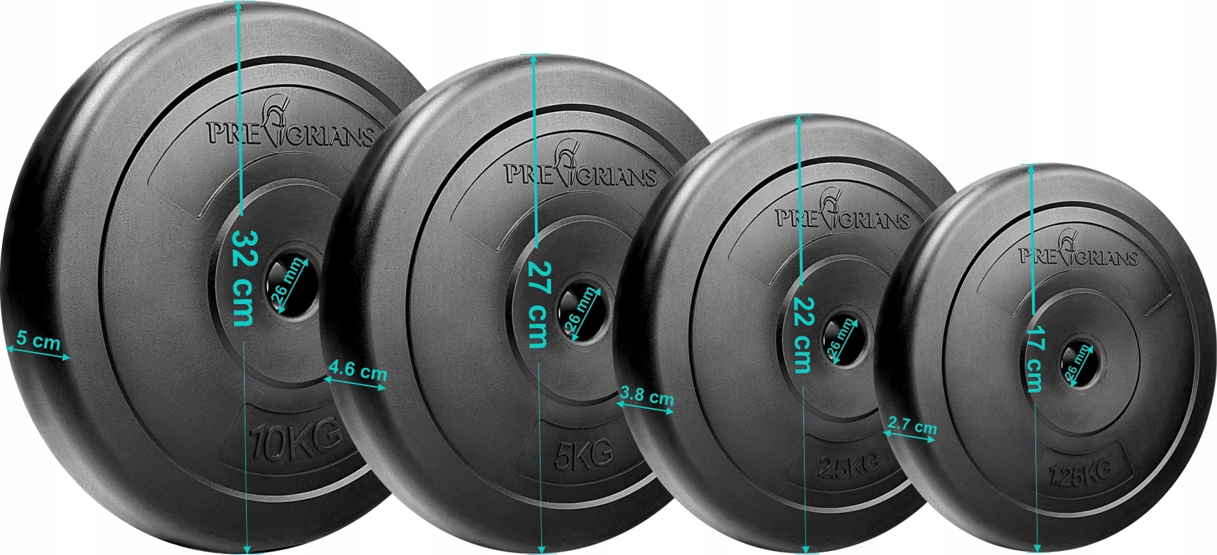 - 4 x 1,25 кг - отверстие для шеи 26 мм, диаметр диска 17см, толщина 2,7см