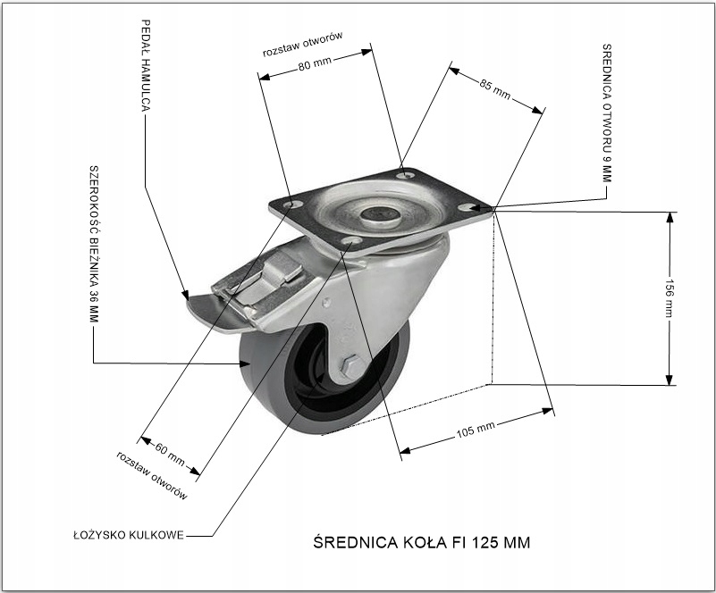 Комплект поворотных колес диаметром 125 мм с тормозом: