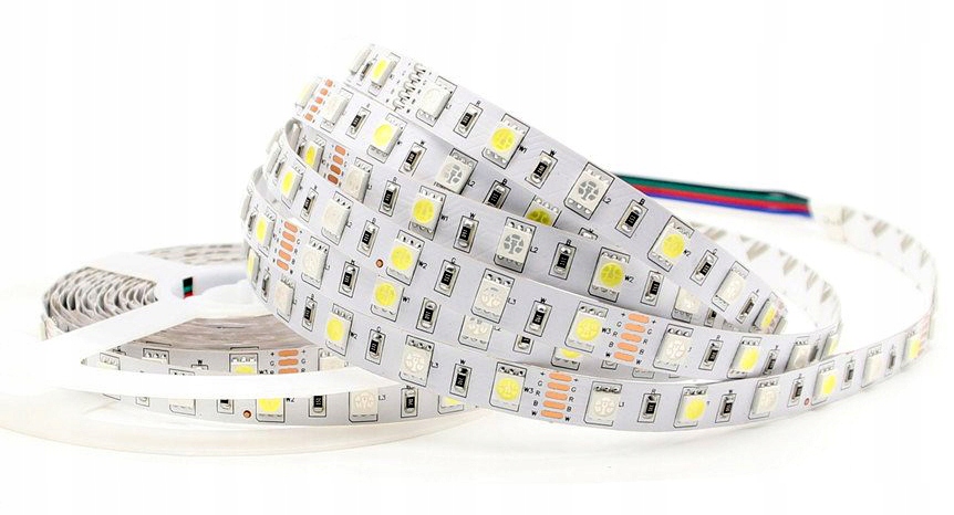 Лента RGBW, в которой светодиоды RGB 5050 (3 чипа) чередуются с белыми светодиодами 5050 (3 чипа), является идеальным решением для всех тех, кто хочет добиться эффекта выбора нескольких цветов с ленты. (красный, зеленый, синий и все их оттенки), а также тем, кто хочет иметь возможность устанавливать теплые, нейтральные или холодные цвета (на выбор)