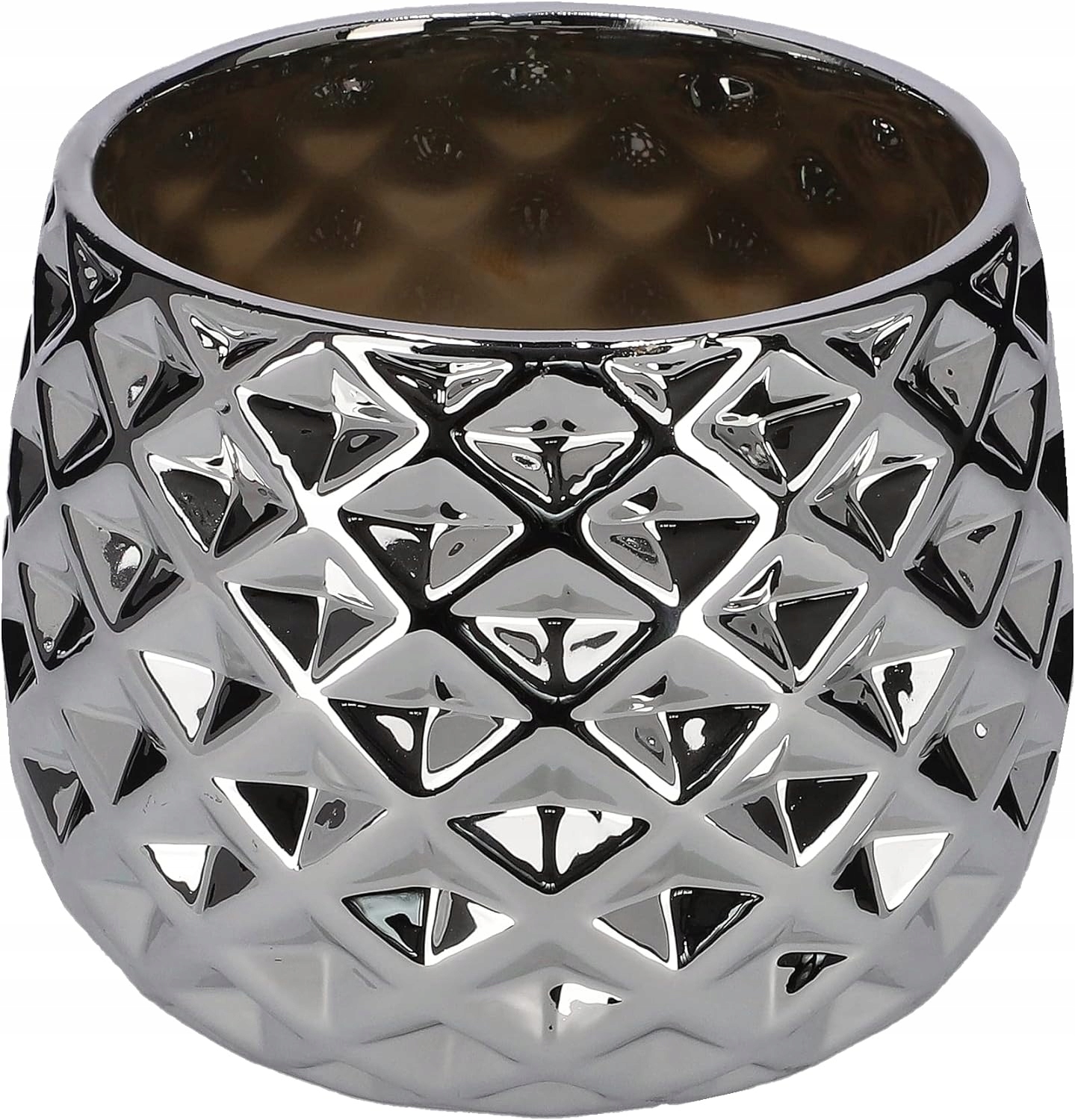 Геометрический декор в сочетании с блестящей поверхностью придает горшку чрезвычайно оригинальный и современный вид. Его форма, слегка суженная к верху, подчеркивает элегантность и позволяет идеально вписаться как в классический, так и в гламурный или минималистичный интерьер.