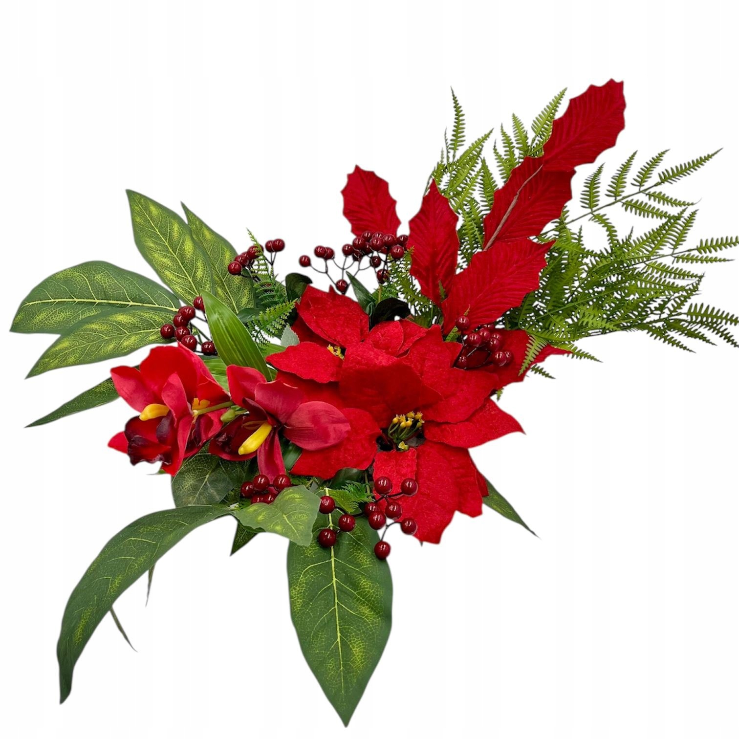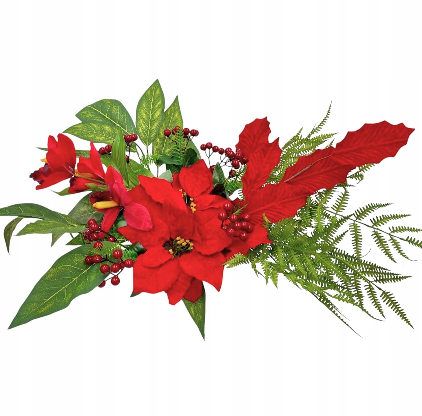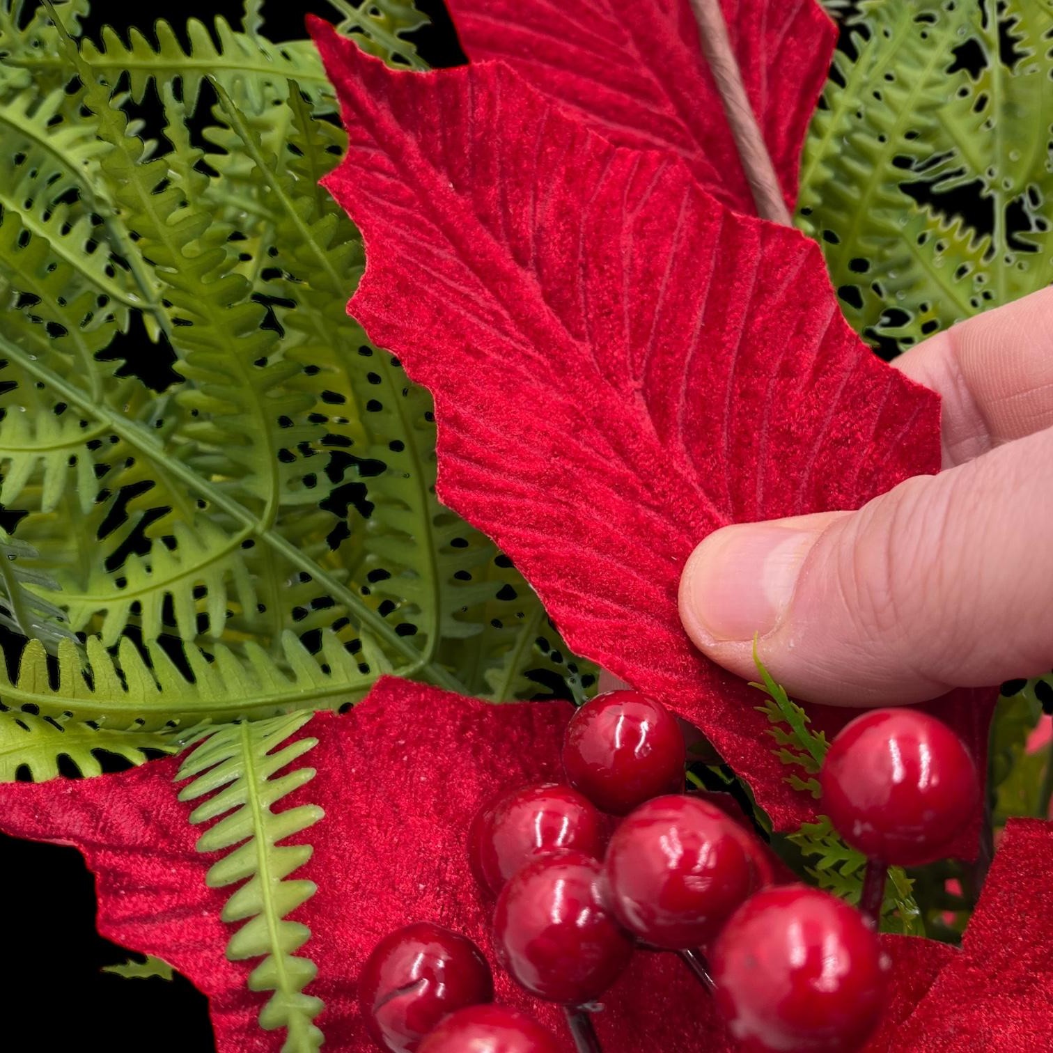 Набор изготовлен из высококачественных искусственных цветов и аксессуаров, создающих неповторимое новогоднее украшение.