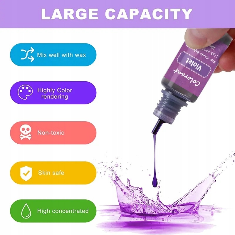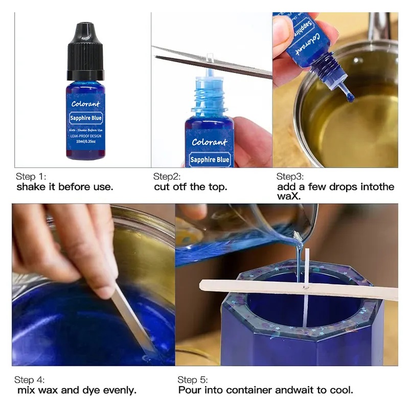 Не нагревайте выше 85°C, перегрев может привести к выцветанию. Отмеряйте по весу или каплям (1 капля ~ 0,01(6) г/10 капель ~ 0,16 г). Большое количество красителя может повлиять на горение свечи! Перед оптовым производством проверьте горение и оттенок на небольшой партии воска. Оттенок красителей может меняться в зависимости от окрашиваемого сырья.