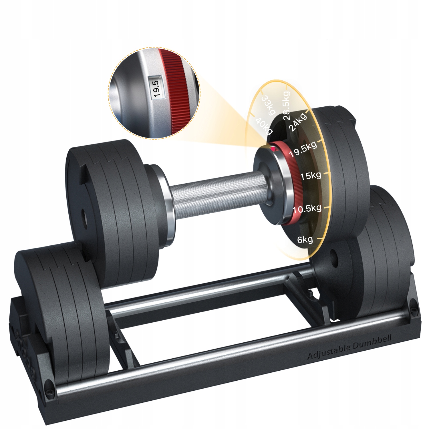 Snode гантелей предлагает 8 уровней регулирования веса от 6 кг до 40 кг. Благодаря точному механизму, в мгновение ока вы приспосабливаетесь к весу к вашим тренировкам, не имея множества пар гантелей. Сплошная черная подставка также включает в себя набор. Вместо беспорядка в вашем домашнем спортзале у вас есть одно компактное, универсальное оборудование!