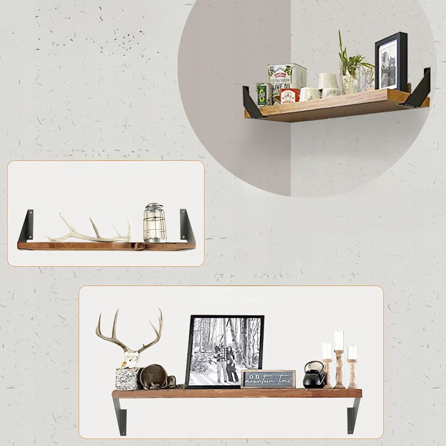 Дизайнерская форма кронштейнов позволяет использовать различные способы установки полок, создавая уникальные эффекты.