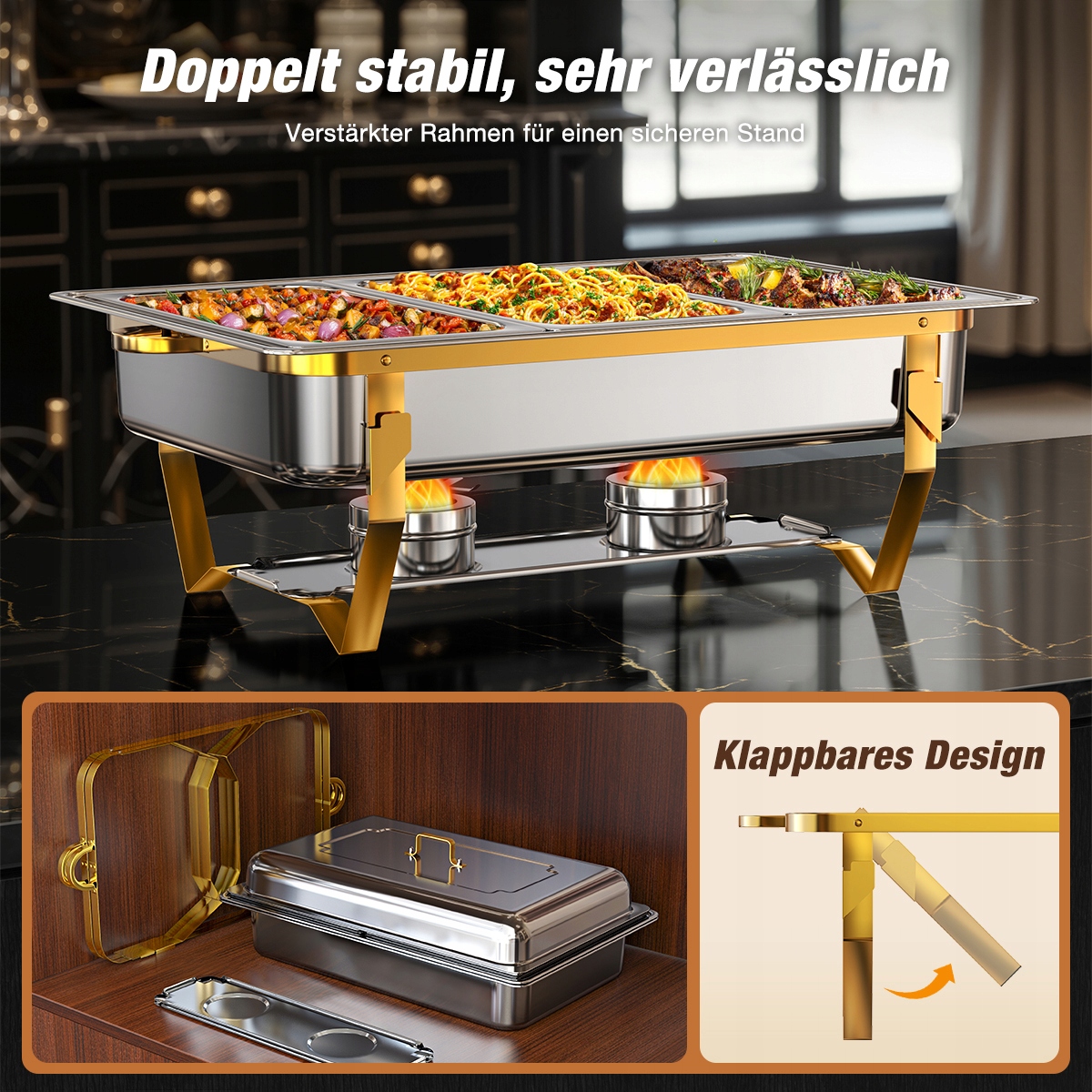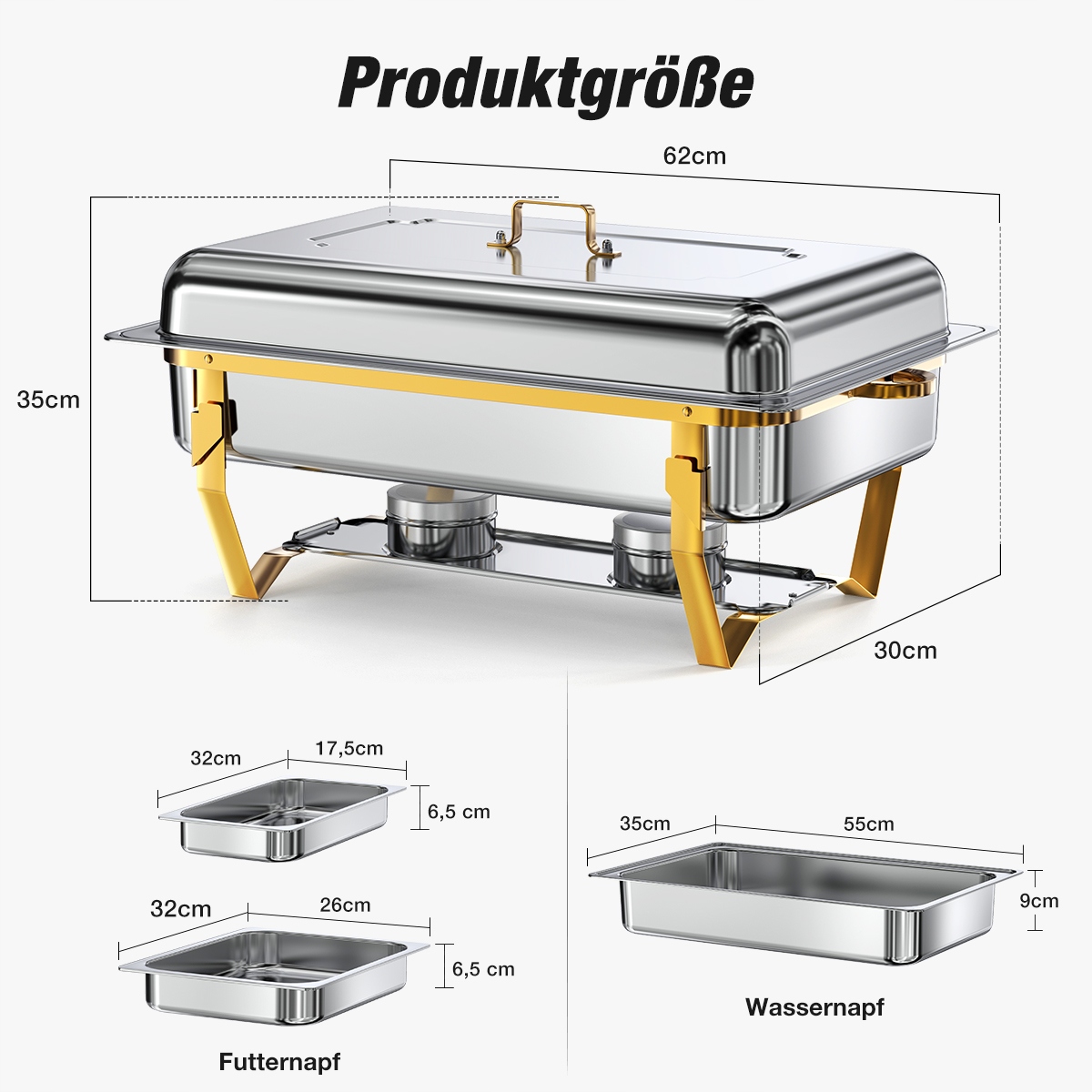 СОЗДАНО ПРОДОЛЖИТЕЛЬНО, БЕЗОПАСНО В ИСПОЛЬЗОВАНИИ. Этот роскошный подогреватель для шведского стола изготовлен из прочной пищевой нержавеющей стали, устойчивой к ржавчине, ударам и износу. Закругленные края из нержавеющей стали обеспечивают безопасное использование и предотвращают случайные порезы при раскладывании или подаче.