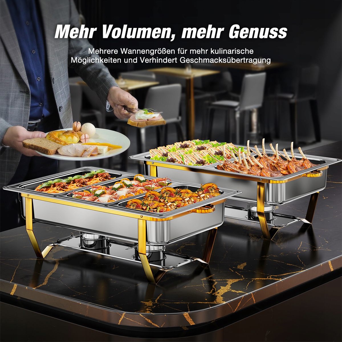 Сохраняйте напитки горячими и холодными в течение нескольких часов. Этот набор из двух золотых подогревателей для шведского стола включает в себя миску для воды и миску для еды, которые вместе сохраняют вашу еду теплой или холодной в течение нескольких часов. Сохраняйте вкус, текстуру и свежесть благодаря стабильному контролю температуры, подходящему для всех фуршетов и мероприятий общественного питания.