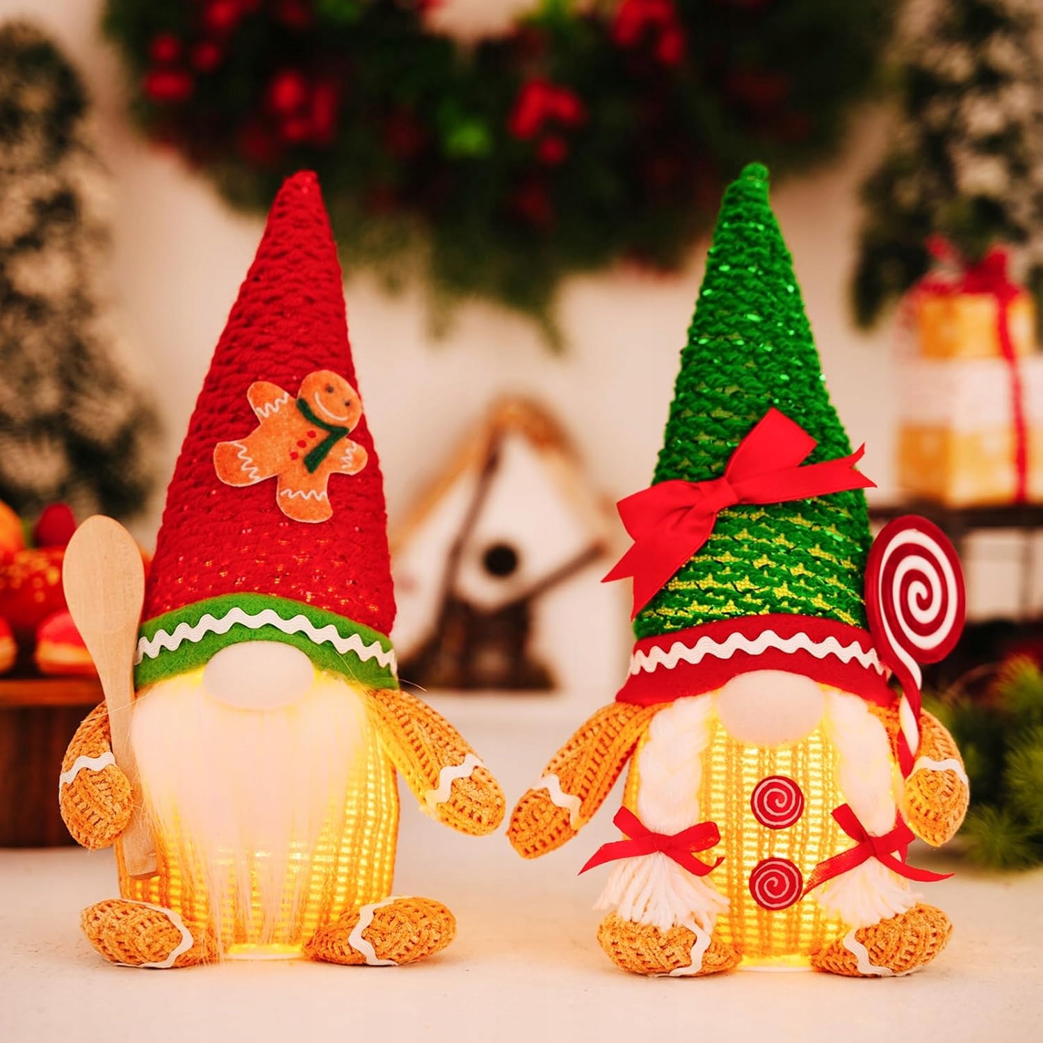 2 предмета рождественских эльфийских украшений со светодиодной подсветкой: Гном-хозяин держит деревянную ложку, а гномичка держит леденец. У них красные и зеленые шерстяные шапки, мягкие плюшевые носы и волокнистые белые бороды, а шапки украшены красными бантами и пряничными фигурками. Они также являются прекрасным подарком, который можно держать в руке. Яркие и теплые гномы - идеальные рождественские украшения и украшения гостиной.