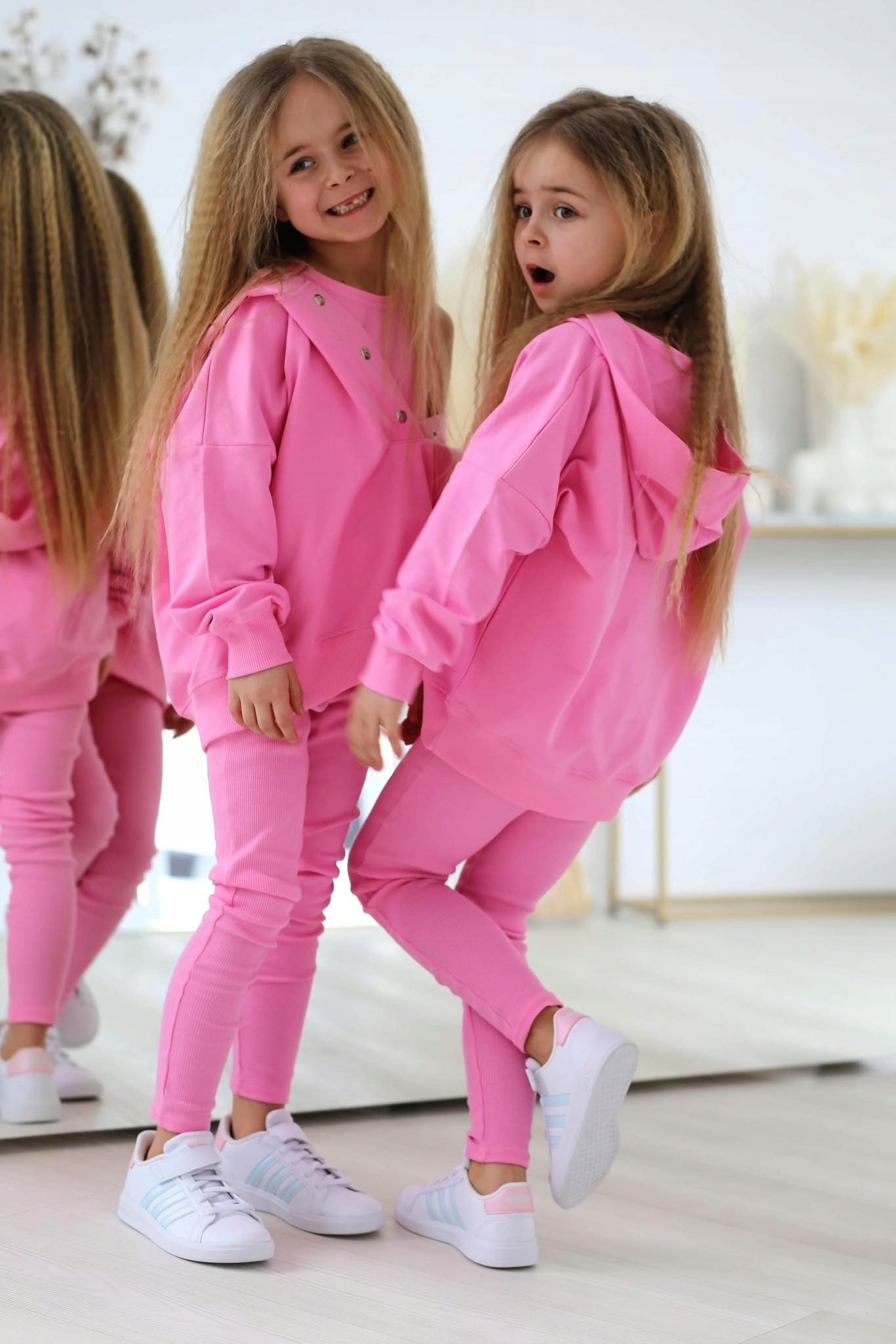 Розовая толстовка имеет практичные кнопки на вырезе, которые облегчают надевание и снимание.